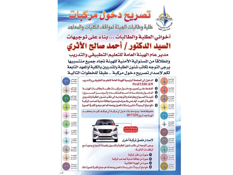 لسد عجز ميزانيتها من جيوب الطلبة، فرضت الهيئة العامة للتعليم التطبيقي والتدريب رسوماً على دخول سياراتهم إلى حرمها، وذلك من خلال شراء ملصق "تصريح دخول مركبات" بقيمة 5 دنانير يسمح للسيارات بالمرور عبر البوابات بشكل رسمي.