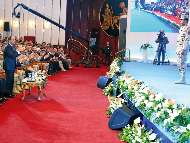 وكشف أن هذا النظام متبع داخل الجيش منذ ثلاثين عاماً، معتبراً أن أخبث وأدهى وسيلة لتدمير الدول هي الإرهاب، وهو ما يقوم حالياً بضرب سورية والعراق وليبيا واليمن. ووجّه السيسي خطابه للجيش المصري، قائلاً: «عرفت قد أيه عظم وشرف مهمتك، وقدسية مهمتك أنت والشرطة، أنت بتحمي شعب ودولة من الضياع وأمة من التشرذم»، مؤكداً أن حماية أبناء الشعب من التحول إلى لاجئين ومروعين أعظم وأشرف مهمة.إلى ذلك، تبنى تنظيم «ولاية سيناء» الفرع المصري لتنظيم داعش، عبر موقع «إنستغرام» أمس، الهجوم الصاروخي على مدينة إيلات الإسرائيلية، أمس الأول، متوعداً بالمزيد من العمليات.وبينما قالت إذاعة الجيش الإسرائيلي إن 4 صواريخ من طراز «غراد» أطلقت من داخل سيناء المصرية وسقطت على مدينة إيلات جنوبي إسرائيل، تصدت منظومة القبة الحديدية إلى ثلاثة منها، وسقط الرابع في منطقة مفتوحة، أعلنت «الخارجية» المصرية إنها تتحقق من صحة تلك التقارير.