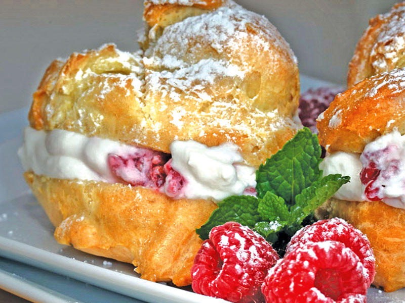 • سخّني الفرن مسبقاً على حرارة 230 درجة مئوية. إذا كنت تملكين حجر البيتزا، ضعيه على أدنى رف (كي تنتفخ المعجنات بسهولة).• سخّني البيض في وعاء من ماء الصنبور الساخن.• في طنجرة متوسطة، اخلطي كوب الماء مع الزبدة والملح وحبيبات السكر واغلي الخليط بالكامل، ثم انزعيه عن النار وأضيفي الفانيلا واسكبي الطحين دفعةً واحدة وحرّكيه بملعقة خشبية لتشكيل كتلة دائرية بسرعة.• أعيدي الصينية إلى حرارة متوسطة وتابعي التحريك واضغطي العجينة على طرف الصينية واجمعيها على شكل كتلة دائرية. هكذا تجفّ العجينة كي تتمكن من امتصاص البيض بشكل أفضل. تابعي التحريك بين دقيقة ودقيقتين لكن لا تدعي العجينة تحترق.• ضعي العجينة في وعاء الخلاط واتركيها جانباً.• في وعاء صغير، اخفقي 3 بيضات دافئة. افصلي البيضة الرابعة وضعي الزلال في طبق صغير واخفقيه. تخلّصي من الصفار أو احتفظي به.• شغّلي الخلاط بسرعة متدنية وأضيفي 3 بيضات كاملة ومخفوقة على ثلاث دفعات وانتظري امتصاص كل دفعة قبل إضافة المزيد. زيدي سرعة الخلاط إلى درجة متوسطة إلى أن يمتزج البيض جيداً. أوقفي الخلاط واختبري العجينة عبر وضع ملعقة منها على طبق. يجب أن تكون ناعمة بما يكفي كي تحافظ على شكلها. إذا بقيت صلبة، أضيفي زلال البيض. وإذا بدت ناعمة جداً، ابدئي بتشكيل المعجنات المنتفخة.• في صينية مغطاة بورق برشمان أو برذاذ طبخ، ضعي ملاعق كبيرة من العجينة واتركي بينها إنشَين على الأقل. في النهاية يجب أن تحصلي على 8 كتل لتحضير معجنات كبيرة الحجم.• استعملي بخاخاً لرش الماء على كل كتلة بهدف إطالة مفعول الرطوبة كي تنتفخ المعجنات قدر الإمكان قبل أن تصبح صلبة.• ضعي الصينية على حجر البيتزا مباشرةً أو على الرف السفلي. خففي حرارة الفرن إلى 220 درجة مئوية. اخبزيها طوال 25 دقيقة. لا تفتحي باب الفرن كي لا تتفتت المعجنات. بعد 25 دقيقة، انزعي الصينية من الفرن واثقبي كل قطعة بسكين صغيرة كي يخرج البخار منها وتجفّ المعجنات. خففي النار إلى 175 درجة واخبزيها طوال 15 دقيقة إضافية، ثم انقليها إلى أحد الرفوف كي تبرد. • لتحضير الحشوة: قبل تقديم التحلية مباشرةً، اخفقي الكريما مع ملعقة كبيرة من السكر الناعم إلى أن تتشكل كتلة ناعمة. احتفظي ببضع حبات كاملة من التوت الأحمر للزينة واسحقي الكمية المتبقية بشوكة ثم اسكبيها في الكريما المخفوقة. قطّعي المعجنات أفقياً إلى النصف بسكين مسننة واملئي النصف السفلي بالكريما ثم أغلقي النصف العلوي. انخلي عليها السكر الناعم وزيّنيها بحبات التوت المتبقية.عشاؤكما في ليلة عيد الحب