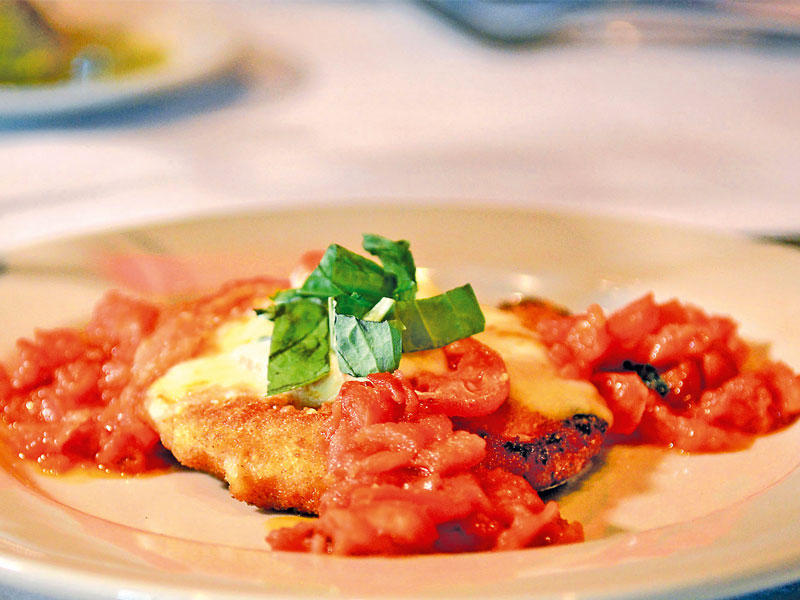 • سخّني الفرن مسبقاً على حرارة 200 درجة مئوية. أزيلي أي دهون وعظام وغضاريف متبقية في أفخاذ الدجاج. ضعي فخذين بين كل ورقتين من الغطاء البلاستيكي. اسحقيهما بالطرف المسنن من مطرقة اللحوم كي يصبحا بالمستوى نفسه من السماكة تقريباً. ثم اسحقي الفخذين المتبقيين بالطريقة نفسها.• تبّلي أفخاذ الدجاج بالملح والفلفل. وزّعي الطحين وفتات الخبز في طبقين، ثم اخفقي البيض في وعاء وغطّسي الدجاج في الطحين وانفضي عنه أي فائض.• غطّسي الأفخاذ المغطاة بالطحين في البيض المخفوق واتركي فائض غموس البيض يقطر في الوعاء.• انقلي الدجاج، قطعة تلو الأخرى، إلى طبق فتات الخبز وغطّسيه بفتات الخبز ثم انفضيه بهدوء واحرصي على تغطية كل فخذ بكمية كافية.• سخّني الزيت النباتي في مقلاة على نار متوسطة أو قوية إلى أن يُصدِر طرف واحد من الأفخاذ المغطاة صوت فرقعة عند تغطيسه في الزيت. عندئذ، أضيفي إلى الزيت كمية الدجاج التي تسع في المقلاة واحرصي على ألا تتلامس القطع. • قلّي قطع الدجاج واقلبيها مرّة واحدة، إلى أن تتحمر من الجهتين وتنضج، مدة 8 دقائق. ثم انقليها إلى صينية مغطاة بمناشف ورقية وصفّيها جيداً. اطبخي بقية الدجاج (عند الحاجة) وأضيفي الزيت وأبقيه على حرارة مناسبة.• انزعي المناشف الورقية من الصينية. فوق كل فخذ دجاج ضعي شرائح متداخلة من الطماطم وقسّميها بالتساوي. إذا أردتِ أن تعطي الطبق طابعاً تقليدياً، اسكبي فوق الدجاج كمية من صلصة الطماطم أيضاً، ثم وزّعي قطع الجبنة فوق الطماطم لتغطية الدجاج بالكامل.• لتحضير الصلصة: سخّني 3 ملاعق كبيرة من زيت الزيتون في مقلاة كبيرة على نار متوسطة. حين يسخن الزيت أضيفي الثوم واطبخيه مدة دقيقتين وهزّي المقلاة إلى أن يتحمّر. اسكبي الطماطم المفرومة بحذر في المقلاة وتبّليها بالملح والفلفل واطبخي الخليط لعشر دقائق إلى أن تزداد سماكة الصلصة. انزعي المقلاة عن النار وضعيها جانباً واستخرجي الثوم.اخبزي الدجاج لعشر دقائق، إلى أن تتحمّر الجبنة قليلاً. أثناء خَبز الدجاج، أعيدي تسخين صلصة الطماطم وأضيفي إليها الريحان وتبّليها بالملح والفلفل عند الحاجة. اسكبي الصلصة فوق طبق ساخن أو في أطباق فردية وضعي الدجاج المخبوز فوق الصلصة.