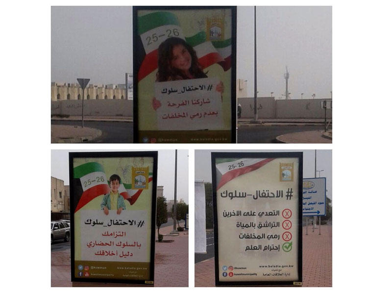 قامت إدارة العلاقات العامة في بلدية الكويت بتركيب اعلانات الـ "موبي" لحملتها الإعلامية الخاصة بالأعياد الوطنية، حيث تضمن الإعلان شعار يحمل عبارة "الاحتفال- سلوك" لإيصال رسالة مباشرة للمواطنين والمقيمين بعدم التعدي على الآخرين والتراشق بالمياه، وعدم رمي المخلفات، إلى جانب احترام الجميع.وأوضح مدير إدارة العلاقات العامة ببلدية الكويت عبدالمحسن أبا الخيل، أن البلدية قامت بتركيب إعلانات الحملة في شوارع وطرق وتقاطعات بالمحافظات الست، ويصل عددها الى 124 إعلان موبي.