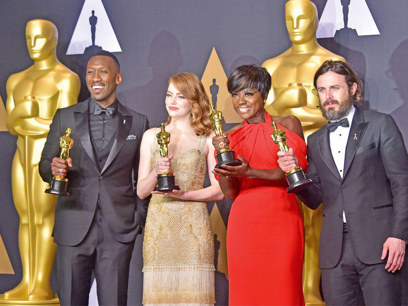 وتوجت إيما ستون التي تغني وترقص وتبكي في هذا الفيلم الرومنسي، أفضل ممثلة متغلبة خصوصا على الفرنسية إيزابيل هوبير.وقالت ستون (28 عاما) لدى تسلمها جائزتها: "التقى الحظ والفرصة"، لكي تنال دورها في الفيلم، "لذا اشكر داميان تشازيل للفرصة التي منحني إياها لأكون ضمن هذا المشروع المميز جدا وهي فرصة فريدة في حياة المرء".وكان فيلم "لا لا لاند" وهو تحية لعصر هوليوود الذهبي مرشحا في 14 فئة.وبعد سنتين من الجدل الحاد والانتقادات بسبب غياب التنوع في جوائز أوسكار، فازت الممثلة السوداء فايولا ديفيس بجائزة أفضل ممثلة في دور ثانوي. وهي تؤدي في "فنسيز" دور امرأة تتعرض للخيانة، أمام دنزل واشنطن مخرج هذا الفيلم الدرامي. وقد وقف لها الحضور مصفقا.كيسي أفليك