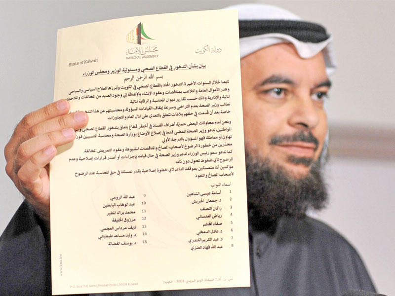 بدوره، قال النائب جمعان الحربش إن طلب تشكيل لجنة تحقيق في عقود التأمين الصحي على المتقاعدين (عافية) وتعيين رؤساء البعثات الخارجية وملف العلاج بالخارج سيتم تقديمه في الجلسة المقبلة من قبل عدد من النواب.وأوضح الحربش في تصريح صحافي في مجلس الأمة أن الملف الصحي متخم بالعديد من التجاوزات وأن هناك قيادات يتم التحقيق معها في النيابة العامة.وأضاف أن من أبرز التجاوزات التلاعب في ملف عقود التمريض عبر دفع الممرضين مبلغ 8 الاف دينار للعمل في وزارة الصحة فضلا عن تدني مستواهم الفني، مشيرا الى ان تغيير شكل تصميم مستشفى العدان من دائري إلى مربع ينتج عنه تخفيض مالي يصل إلى 20 مليون دينار من دون تغيير قيمة العقد، بالاضافة الى عقد «اتنا» في الولايات المتحدة.وذكر أن عددا من النواب أعلنوا في بيان سابق دعم سمو رئيس مجلس الوزراء في حالة تقديم إجراءات إصلاحية تتعلق بملف وزارة الصحة، مشيرا في هذا الصدد إلى ورود معلومات أن الوزير قد مُكن من استخدام أدواته.وأشاد بالدور الإصلاحي لوزير الصحة لمواجهة تلك التجاوزات مطالبا كل الوزراء بأن يتحلوا بنفس إصلاحي وإعلاء المصلحة العامة.وقال الحربش ان «محاولات البعض اظهاري بأنني أنتقم لشقيقي فشلت امام هذا الاصطفاف الوطني للنواب تجاه قضايا الفساد»، لافتا الى الطلب النيابي للتحقيق في اهم ملفات وزارة الصحة التي دار حولها الحديث ولن يستثنى منها اي ملف وأولها العلاج في الخارج والمكاتب الخارجية.وقال الحربش إنه فيما يخص التحقيق في وفاة النائب السابق فلاح الصواغ فإن تقرير اللجنة الصحية يفيد بأن وزارة الصحة امتنعت عن تقديم الوثائق، مشيرا إلى أنه سيطالب في الجلسة المقبلة بعودة التقرير إلى اللجنة لإلزام الوزارة باستكمال البيانات وتكليف اللجنة الصحية دراسة تقديم بلاغ جديد للتحقيق في الوفاة.