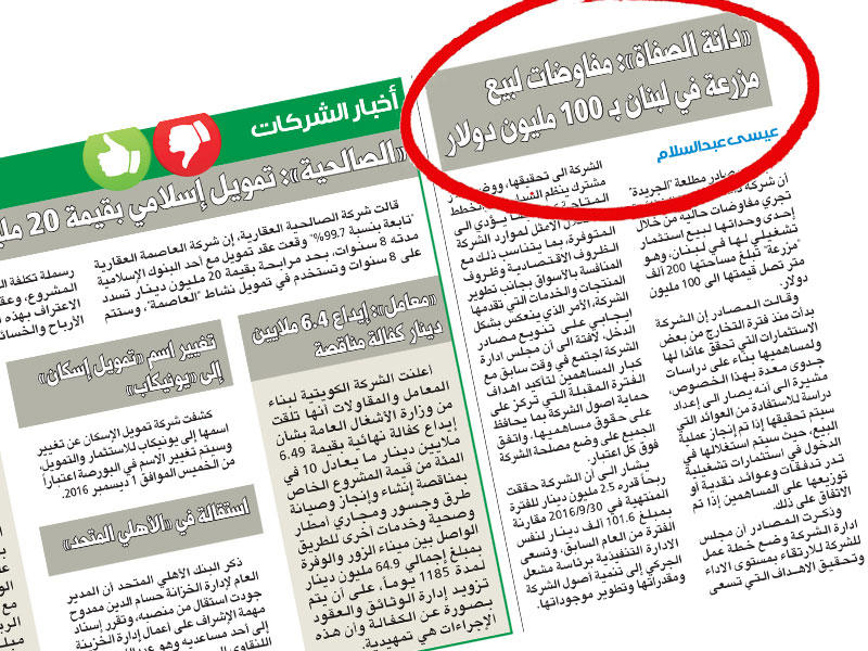 أفادت شركة دانة الصفاة الغذائية بأنها تلقت عرضا من إحدى الشركات لشراء كل الوحدات التشغيلية لشركة إف آند بي فنتشر هولدينغ في لبنان، وبناء على ذلك قرر مجلس إدارة الشركة عقد اجتماع عاجل لدراسة هذا العرض.وكانت «الجريدة» قد نشرت في عددها الصادر بتاريخ 29 نوفمبر الماضي خبرا عن مفاوضات تجريها الشركة من خلال إحدى وحداتها لبيع استثمار تشغيلي لها في لبنان، وهو عبارة عن مزرعة تبلغ مساحتها 200 الف متر، وتصل قيمتها الى 100 مليون دولار، ونفى الرئيس التنفيذي في الشركة، مشعل الجاركي، وقتها ما جاء في هذا الخبر، مؤكدا أن إدارة الشركة تعلن التزامها الكامل بتطبيق ما جاء في الكتاب العاشر من اللائحة التنفيذية بشأن الإفصاح والشفافية. ولم تتطرق الشركة في نفيها الى وجود أي مفاوضات ولو كانت مبدئية بشأن بيع استثمارها في لبنان.