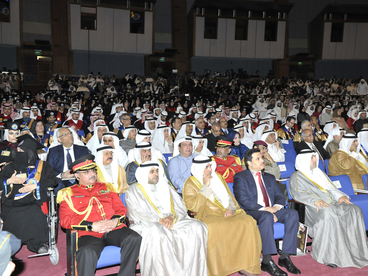 وشهد حفل التخرج سمو ولي العهد الشيخ نواف الأحمد الجابر الصباح ورئيس مجلس الأمة مرزوق علي الغانم والشيخ جابر العبدالله الجابر الصباح والشيخ فيصل السعود المحمد الصباح والشيخ ناصر المحمد الأحمد الصباح وسمو الشيخ جابر المبارك الحمد الصباح رئيس مجلس الوزراء والنائب الأول لرئيس مجلس الوزراء ووزير الخارجية الشيخ صباح الخالد الحمد الصباح ونائب رئيس مجلس الوزراء ووزير الدفاع الشيخ محمد الخالد الحمد الصباح ونائب وزير شؤون الديوان الأميري الشيخ علي جراح الصباح ونائب رئيس مجلس الوزراء ووزير الداخلية الشيخ خالد الجراح الصباح والوزراء وكبار المسؤولين بالدولة وكبار القادة بالجيش والشرطة والحرس الوطني وجمع غفير من أهالي الطلبة الخريجين والمواطنين.وبدأ الحفل بالسلام الوطني وتلاوة آيات من القرآن الكريم ثم ألقى وزير التربية ووزير التعليم العالي الرئيس الأعلى للجامعة معالي الدكتور محمد عبداللطيف الفارس كلمة هذا نصها:«بسم الله الرحمن الرحيمحضرة صاحب السمو أمير البلاد الشيخ صباح الأحمد الجابر الصباح حفظه الله ورعاهسمو الشيخ نواف الأحمد الجابر الصباح ولي العهد حفظه اللهسعادة السيد مرزوق علي الغانم رئيس مجلس الامة الموقرسمو الشيخ جابر المبارك الحمد الصباح رئيس مجلس الوزراء الموقرأصحاب المعالي والسعادةأعضاء هيئة التدريس وأولياء أمور الخريجينأبنائي وبناتي الخريجين والخريجاتالحضور الكريمالسلام عليكم ورحمة الله وبركاتهإن جامعة الكويت التي تتشرف اليوم يا صاحب السمو برعايتكم الكريمة لحفل الخريجين المتفوقين في كلياتها المختلفة لتزهو بهذا الشرف العظيم الذي عودتم عليه أبناءكم المتفوقين كل عام لتكونوا بينهم وإن هذا الشرف ليتعاظم هذا العام لتزامنه مع الاحتفالات الوطنية والممثلة بالاحتفال بالعيد الوطني للاستقلال وبعيد التحرير وانتصار الكويت على الغازي المعتدي وبالاحتفال يتولى سموكم مقاليد الحكم وتزامنه كذلك مع احتفال جامعة الكويت باليوبيل الذهبي وذكرى مرور خمسين عاماً على إنشاء هذه الجامعة الفتية وبهذه المناسبة فيشرفنا أن نتقدم بخالص التهنئة لصاحب السمو الشيخ صباح الأحمد الجابر الصباح أمير البلاد حفظه الله ورعاه ولسمو الشيخ نواف الأحمد الجابر الصباح ولي العهد ولسمو الشيخ جابر المبارك الحمد الصباح رئيس مجلس الوزراء حفظهما الله ورعاهما وللزميلات وللزملاء الأفاضل أساتذة جامعة الكويت ولطلابها وطالباتها ولخريجي وخريجات الجامعة وللشعب الكويتي الكريم.إنها مناسبة عزيزة نستنكر فيها المراحل التي مرت على الجامعة وما قام به الأخوة الأفاضل السابقون من عمل جبار لإنشاء الجامعة يحدوهم في ذلك النية الصالحة والعمل الوطني الخالص وقد تخرج من جامعة الكويت أعداد كبيرة من أبناء وطننا العزيز تبوأ بعضهم المناصب العليا في الدولة كما تخرج منها أعداد كبيرة من أبناء الخليج العربي حصدوا ثمار تخرجهم بتدرجهم في الوظائف حتى أرتقوا إلى القيادات العليا للهرم الإداري ببلادهم من الوزراء والمدراء ولم يقتصر ذلك على الكويت والخليج العربي بل استفاد أبناء الوطن العربي من الدراسة في جامعة الكويت كذلك.لقد تحمل الجيل الماضي من أبناء وطننا مسئولية قيام الدولة الحديثة بانشاء هيكلها الإداري والتنظيمي والمالي والسياسي وسيلتهم في ذلك الإخلاص لوطنهم وصدق نواياهم وآن لهذا الجيل أن يكمل المسيرة بتحمل المسئولية الملقاة على عاتقه.يا صاحب السمو:إن حضوركم الكريم بين أبنائكم المتفوقين من طلبة الجامعة كل عام لهو دليل على حرص سموكم على شباب هذا الوطن واعتزازكم به باعتباره ذخيره لبلدنا.يا صاحب السمو:نحن نعيش في عالم متسارع الخطى في ظل التطور التكنولوجي والعلمي الهائل الذي يعيشسه العالم اليوم إن وتيرة هذا التسارع أصبحت مذهلة مما يصعب على بعض الدول اللحاق بهذا التطور وعلينا في دولة الكويت أن نعي ذلك وأن نضع في الحسبان أن هذا العالم المتسارع في الإبداع والتميز لن ينتظر اللحاق به مما يفرض على كل الجها
