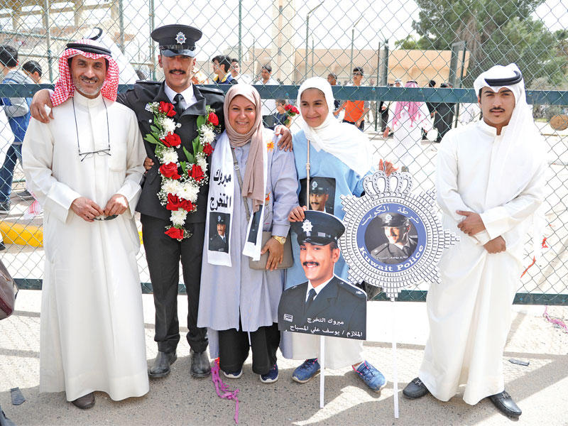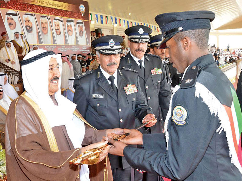برعاية وحضور سمو أمير البلاد الشيخ صباح الأحمد، القائد الأعلى للقوات المسلحة، أقيم صباح امس حفل تخريج الدفعة 43 من الطلبة الضباط، والدفعة 28 من الطلبة ضباط الاختصاص، والدفعة 9 من طالبات الاختصاص بمعهد الشرطة النسائية، في ميدان أكاديمية سعد العبدالله للعلوم الأمنية.ووصل موكب سموه إلى مكان الحفل، حيث استقبل بكل حفاوة وترحيب من نائب رئيس مجلس الوزراء وزير الداخلية الشيخ خالد الجراح، ومستشار وزير الداخلية الفريق أول متقاعد سليمان الفهد، ووكيل الوزارة بالإنابة اللواء محمود الدوسري، ووكيل الوزارة المساعد لقطاع شؤون التعليم والتدريب اللواء الشيخ فيصل النواف، والوكلاء المساعدين بوزارة الداخلية.وشهد حفل التخرج سمو ولي العهد الشيخ نواف الأحمد، ورئيس مجلس الأمة مرزوق الغانم، والشيخ جابر العبدالله، والشيخ فيصل السعود، ونائب رئيس الحرس الوطني الشيخ مشعل الاحمد، وسمو الشيخ ناصر المحمد، ورئيس مجلس الوزراء سمو الشيخ جابر المبارك، ورئيس المجلس الأعلى للقضاء رئيس محكمة التمييز رئيس المحكمة الدستورية المستشار يوسف المطاوعة، والنائب الأول لرئيس مجلس الوزراء وزير الخارجية الشيخ صباح الخالد، ونائب رئيس مجلس الوزراء وزير الدفاع الشيخ محمد الخالد، ونائب وزير شؤون الديوان الأميري الشيخ علي الجراح، وكبار المسؤولين بالدولة، وجمع غفير من أهالي الطلبة الخريجين والمواطنين.