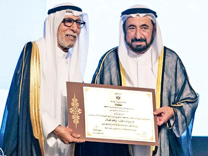 كرم حاكم الشارقة الشيخ سلطان القاسمي، الفنان الكبير إبراهيم الصلال؛ لفوزه بجائزة الشارقة للإبداع المسرحي العربي، في افتتاح «أيام الشارقة المسرحية».