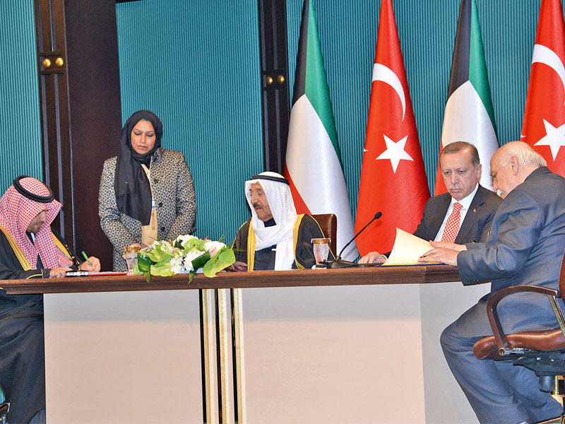 وبحضور صاحب السمو والرئيس التركي، وُقعت مساء امس في القصر الرئاسي بالعاصمة أنقرة ست اتفاقيات ثنائية بين البلدين، وهي:1 - اتفاقية منحة للإسهام في خطة الاستجابة لأزمة اللاجئين السوريين في تركيا (بلدية كيليس) مخصصة من الصندوق الكويتي للإسهام في خطط الاستجابة لأزمة اللاجئين السوريين في الدول المستضيفة بين حكومة تركيا، والصندوق الكويتي للتنمية الاقتصادية العربية، حيث وقعها عن الكويت رئيس الصندوق الكويتي للتنمية عبدالوهاب البدر، وعن تركيا عمدة «كيليس» حسن قارة (وفقا لالتزامات الكويت في مؤتمر المانحين الرابع بلندن). 2 - اتفاقية لدعم اللاجئين السوريين ببلدية «شانلي أورفه»، وقعها البدر عن حكومة الكويت، وعمدة بلدية شانلي أورفة نهاد جفتجي عن الحكومة التركية.3 - اتفاقية لدعم لاجئي بلدية «غازي عنتاب» وقعها البدر عن حكومة الكويت، وعمدة بلدية غازي عنتاب فاطمة شاهين عن الحكومة التركية.4 - مذكرة تفاهم في مجال التعاون العسكري بين البلدين، وقعها عن الكويت اللواء الركن عبدالرحمن الهدهود، وعن تركيا الفريق عثمان آرباش.5 - مذكرة تفاهم للتعاون في مجال الشؤون الإسلامية، وقعها عن الكويت النائب الأول لرئيس مجلس الوزراء وزير الخارجية الشيخ صباح الخالد، وعن تركيا رئيس الشؤون الدينية د. محمد كورماز. 6 - اتفاقية تعاون في المجال السياحي، وقعها عن الكويت نائب رئيس مجلس الوزراء وزير المالية أنس الصالح، وعن الجانب التركي وزير الثقافة والسياحة نابي آفجي.تبادل الأوسمة
