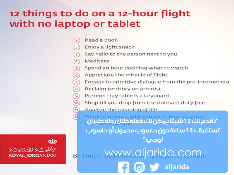 حاولت الخطوط الجوية الملكية الاردنية التخفيف من وقع قرار حظر الأجهزة الإلكترونية في مقصورات الطائرات مقترحة حلولا بديلة طريفة على ركابها.ونشرت الشركة، وهي الناقل الجوي الوطني في الاردن، على صفحتها على موقع فيسبوك للتواصل الاجتماعي منشورين اثر قرار الولايات المتحدة الثلاثاء حظر ادخال أجهزة الكمبيوتر المحمولة والألواح والالعاب الإلكترونية الى مقصورات الطائرات المتجهة مباشرة إليها من سبع دول عربية هي الاردن ومصر والسعودية والكويت وقطر والامارات العربية والمغرب، وتركيا، مشيرة الى خطر وقوع اعتداءات "ارهابية". ثم حذت بريطانيا حذوها وفرضت الحظر على شركات ست دول.