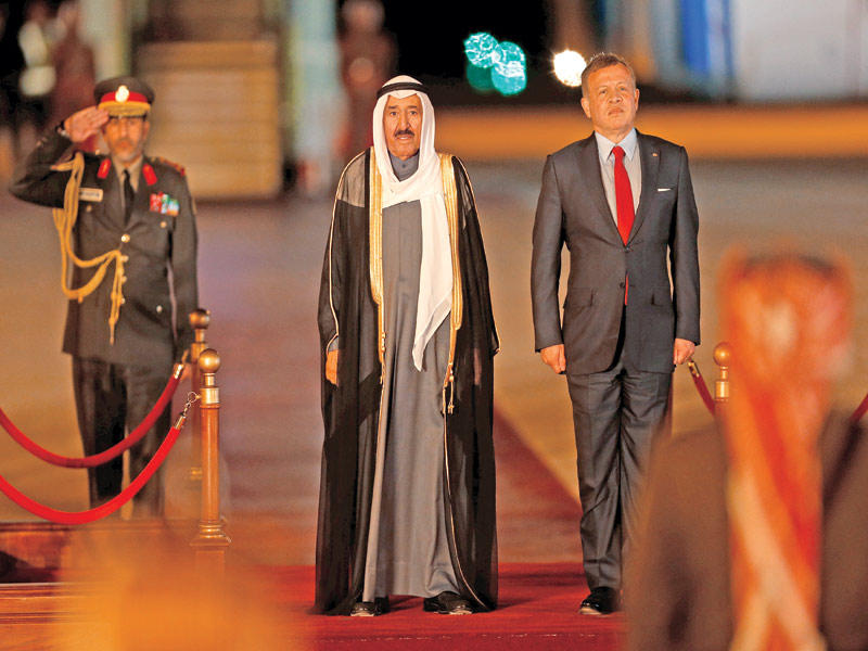 وصل صاحب السمو أمير البلاد الشيخ صباح الأحمد، والوفد الرسمي المرافق لسموه، مساء أمس، إلى المملكة الأردنية الهاشمية الشقيقة، لترؤس وفد الكويت في مؤتمر مجلس جامعة الدول العربية، الدورة العادية الثامنة والعشرين على مستوى القمة العربية.وكان في استقبال سموه على أرض المطار أخوه ملك المملكة الأردنية الهاشمية الملك عبدالله الثاني، وصاحب السمو الملكي الأمير طلال بن محمد المستشار الخاص للملك، والأمين العام لجامعة الدول العربية أحمد أبو الغيط، ورئيس مجلس الوزراء الأردني د. هاني الملقي، ورئيس الديوان الملكي الهاشمي د. فايز الطراونة، ووزير الخارجية وشؤون المغتربين أيمن الصفدي والوزراء، وسفير الكويت لدى المملكة الأردنية الهاشمية د. حمد الدعيج وأعضاء السفارة.وقد غادر سموه والوفد الرسمي المرافق له أرض الوطن، عصر أمس، متوجها إلى المملكة الاردنية الهاشمية، وكان في وداع سموه على أرض المطار سمو نائب الأمير وولي العهد الشيخ نواف الأحمد، ورئيس مجلس الأمة مرزوق الغانم والشيخ جابر العبدالله والشيخ فيصل السعود ونائب رئيس الحرس الوطني الشيخ مشعل الأحمد وسمو الشيخ ناصر المحمد وسمو رئيس مجلس الوزراء الشيخ جابر المبارك ونائب رئيس مجلس الوزراء وزير الدفاع الشيخ محمد الخالد ونائب وزير شؤون الديوان الأميري بالإنابة الفريق م. خالد بودي ووزير الدولة لشؤون مجلس الوزراء وزير الإعلام بالوكالة الشيخ محمد العبدالله وكبار المسؤولين بالدولة وكبار القادة بالجيش والشرطة والحرس الوطني والإدارة العامة للإطفاء.