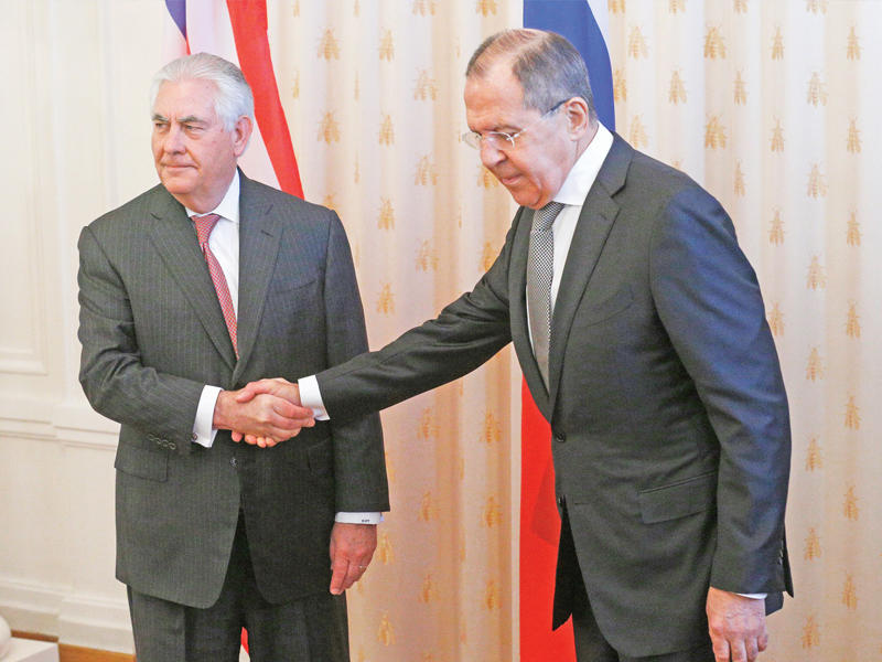 وفي مستهل لقائه الأول مع تيلرسون في موسكو، شدد وزير الخارجية الروسي سيرغي لافروف على أهمية منع تكرار الضربات على سورية في المستقبل، وأهمية إيضاح آفاق التعاون مع واشنطن.وأبلغ لافروف تيلرسون بأن بلاده ترفض «مبدأ إما معنا أو ضدنا، وتريد معرفة النوايا الحقيقية لإدارة الرئيس ترامب»، مشيراً إلى أن مواقفها من العلاقة مع موسكو متناقضة، ولابد من ايضاح آفاق التعاون في إطار حوار بناء ومتساو.من جهته، دعا تيلرسون إلى نقاش «صريح وصادق»، وصولا إلى علاقة إيجابية، مطالبا بتحديد أسباب وعواقب الاختلافات وحل المقاربات العملية المختلفة عبر استمرار الحوار والاتصال. ووفق وزارة الخارجية الروسية، فإن الوزيرين بحثا إنشاء مناطق حظر جوي في سورية.الخيار العسكري