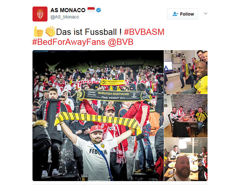 تعاطفت جماهير نادي بروسيا دورتموند مع أنصار نادي موناكو بعد التفجيرات التي أدت إلى إرجاء مباراة الفريقين، حيث وجهت الجماهير الألمانية دعوة للإقامة المجانية للفرنسيين بفضل هاشتاغ #bedforawayfans.