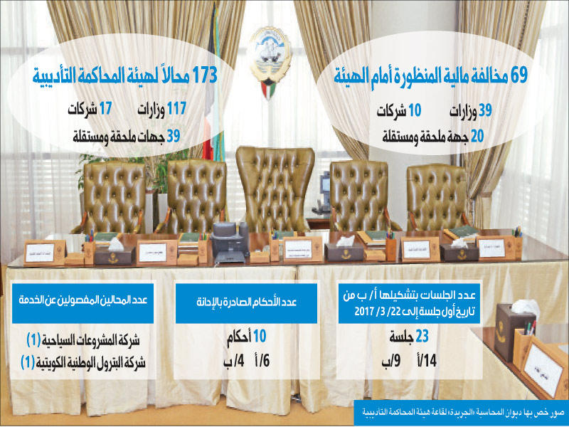 - موضوع الإحالة يبدأ من ديوان المحاسبة، عندما يرصد ملاحظات أو مخالفات على أي جهة خاضعة لرقابته، فيطلب من تلك الجهة المعنية إجراء تحقيق موسع فيها، أو حينما تبادر الجهة بالتحقيق في ما ترصده من تجاوزات، وفي كلا الحالتين يطلب الديوان من الجهات المشمولة بالرقابة إجراء التحقيق وافادته بنتيجته، وقرار التصرف الصادر منها بهذا الشأن، ومحاضر التحقيق وكل ما يتصل به من أوراق ومستندات.وبلغ عدد المخالفات، التي تمت إحالتها إلى هيئة المحاكمة التأديبية منذ إقرار القانون ودخوله حيز التنفيذ حتى تاريخه، 69 مخالفة 39 منها خاصة بالوزارات و10 مخالفات بالشركات و20 مخالفة خاصة بجهات ملحقة ومستقلة.وبلغ عدد المحالين بهذه المخالفات 173، بواقع «117 من الوزارات، و17 من الشركات، و39 من الجهات الملحقة والمستقلة»، وصدرت 10 احكام بينها العزل من الوظيفة.