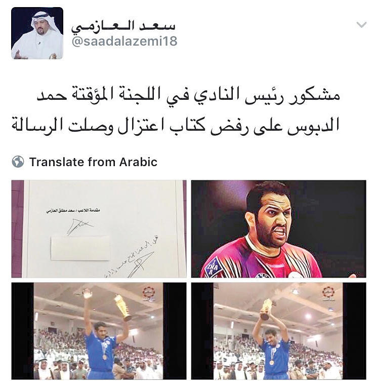 انتقد قائد الفحيحيل والمنتخب الوطني السابق لكرة اليد سعد العازمي، موقف ناديه بعدما رفض مجلس إدارته إدراج الطلب المقدم في 27 فبراير الماضي بمحضر جلسته الأخيرة، والذي طلب فيه اللاعب الحصول على كتاب اعتزال من النادي، ليتسنى له الحصول على مستحقات الاعتزال من الهيئة العامة للرياضة.وكتب العازمي تغريدات في حسابه الشخصي على موقع التواصل الاجتماعي "توتير" أمس ، قال فيها "مشكور رئيس النادي حمد الدبوس على رفض كتاب الاعتزال، الرسالة وصلت"، مضيفا "ياريت تكون روحك رياضية وتوقع على كتاب الاعتزال، بلغني أنك شلته من محضر الاجتماع السابق. على فكرة عندي نسخة منه".