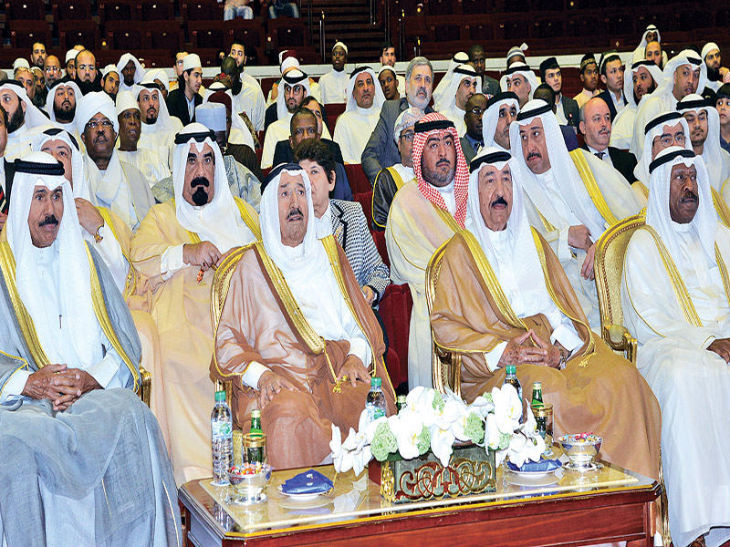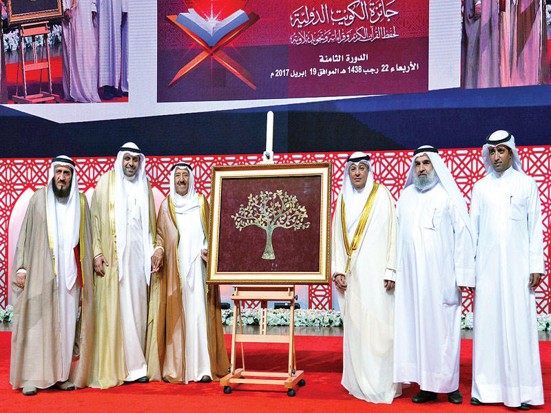 تحت رعاية وحضور صاحب السمو أمير البلاد الشيخ صباح الأحمد، أقيم صباح أمس، حفل جائزة الكويت الدولية لحفظ القرآن الكريم وقراءاته وتجويد تلاوته بدورتها الثامنة وذلك على مسرح قصر بيان.واستقبل صاحب السمو بكل حفاوة وترحيب من قبل كل من وزير الأوقاف والشؤون الإسلامية وزير الدولة لشؤون البلدية محمد الجبري وأعضاء لجنة المسابقة.وشهد الحفل سمو ولي العهد الشيخ نواف الأحمد والشيخ جابر العبدالله وسمو رئيس مجلس الوزراء الشيخ جابر المبارك ورئيس المجلس الأعلى للقضاء ورئيس محكمة التمييز ورئيس المحكمة الدستورية المستشار يوسف المطاوعة ورئيس مجلس الأمة بالإنابة عيسى الكندري والنائب الأول لرئيس مجلس الوزراء وزير الخارجية الشيخ صباح الخالد ونائب رئيس مجلس الوزراء وزير الدفاع الشيخ محمد الخالد ونائب وزير شؤون الديوان الأميري الشيخ علي الجراح ونائب رئيس مجلس الوزراء وزير الداخلية الشيخ خالد الجراح والوزراء وكبار المسؤولين بالدولة وكبار القادة بالجيش والشرطة والحرس الوطني.وبدأ الحفل بالنشيد الوطني ثم تلاوة آيات من الذكر الحكيم بعدها ألقى الوزير الجبري كلمة ثمن فيها مناسبة تكريم ثلة مباركة من شباب الأمة الإسلامية جاءوا من أرجاء الدنيا وقد حملوا في صدورهم القرآن الكريم للتنافس والتسابق فيه وقد توافدوا إلى هذا البلد الطيب الذي جبل أبناؤه على حب القرآن وتنافس أهله قيادة وحكومة وشعبا على القيام بخدمته وفي مقدمة ذلك الرعاية السامية لهذه المسابقة المباركة.