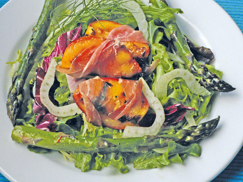 حين تصبحين جاهزة لإضافة صلصة الخل، قومي بذلك قبل تقديم السلطة مباشرةً كي لا تنتقع فيها الخضراوات. اسكبي بين ملعقتين وثلاث ملاعق كبيرة من صلصة الخل على طول المحيط الداخلي من وعاء السلطة (الأقرب إلى الأطراف). بدءاً من الأطراف، استعملي ملقط السلطة لسحب الخضراوات (ومقادير أخرى) إلى الوسط وحركيها قليلاً.يجب ألا تنتقع الخضراوات والمقادير الأخرى لدرجة أن تصبح ليّنة جداً. تذكّري أن الخضراوات اللينة ومنتجات الخس والملفوف الأحمر تحتاج إلى كمية أقل من الصلصة.الوصفة أدناه رائعة فعلاً كونها تجمع الدراق والشمار والهليون فوق طبقة من الخضراوات. يمكنك إضافة الأصناف التي تفضّلينها. تقتصر مرحلة الطبخ على شوي الدراق والهليون. يمكن شوي الشمار أيضاً وتقطيعه إلى قطع أكبر حجماً كي لا تقع بين شبكات المشواة.