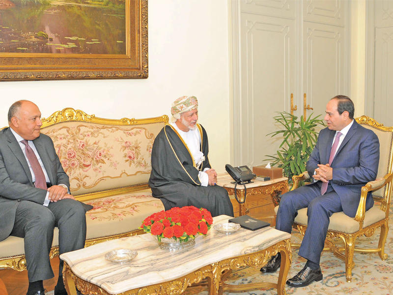 السيسي مستقبلاً وزير خارجية عُمان يوسف بن علوي بحضور نظيره المصري سامح شكري أمس في القاهرة (الجريدة)