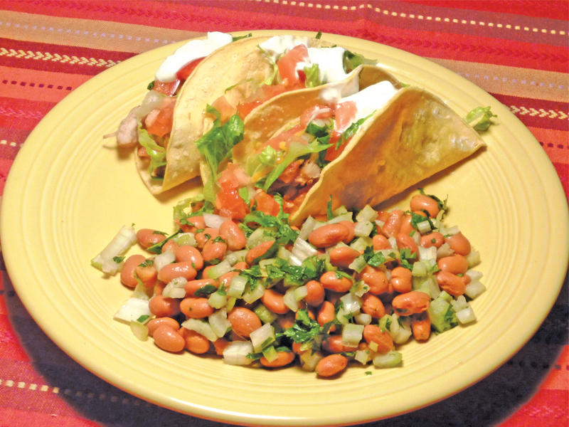 • اخلطي الكمون مع عصير البرتقال وصلصة الفلفل الحار. أضيفي الدجاج وانقعيه أثناء تحضير المقادير المتبقية. غلّفي قطع التورتيلا في منشفة ورقية رطبة واضبطي المايكروويف على حرارة عالية طوال 45 ثانية، ثم انزعيها منه واثنيها إلى النصف على شكل تاكو. قسمي الجبنة على 6 قطع تاكو. انزعي الدجاج من النقيع بملعقة مثقوبة وقسميه على ست قطع تاكو. رشّي القليل من صلصة الفلفل الحار فوق الدجاج. أضيفي الخس والطماطم فوق التاكو. ثم اسكبي ملعقة من الكريما الحامضة. قدمي صلصة الفلفل الحار إلى جانب التاكو.في الحصة: 430 سعرة حرارية (23% من الدهون)، 11.1 غراماً من الدهون (4.4 غرامات من الدهون المشبعة، 2.9 غرام من الدهون أحادية عدم الإشباع)، 103 ملغ من الكولسترول، 38.6 غراماً من البروتينات، 45.4 غراماً من الكربوهيدرات، 6.1 غرامات من الألياف، 302 ملغ من الصوديومسلطة بالفاصوليا المرقطة