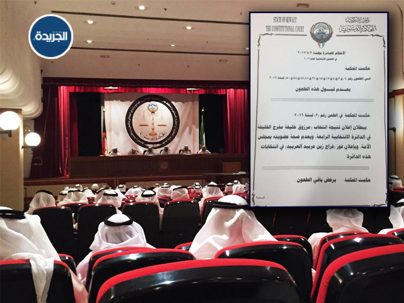 أعلنت المحكمة الدستورية فوز فراج العربيد بعضوية مجلس الأمة 2016 وبطلان عضوية مرزوق الخليفة ورفض باقي الطعون الانتخابية المقدمة إليها.وكانت المحكمة قررت في فبراير الماضي حجز الطعون الانتخابية كافة المقدمة من قبل عد من الطاعنين في نتائج انتخابات مجلس الأمة 2016 بالدوائر الانتخابية الخمس الى جلسة اليوم الأربعاء للنطق بالحكم.