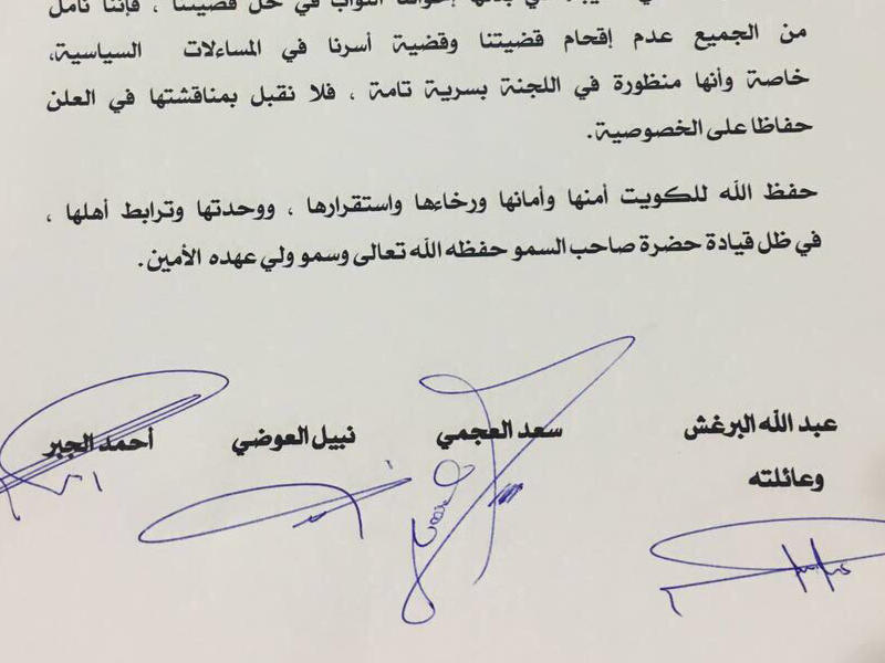 وقالت عائلة البرغش وسعد العجمي ونبيل العوضي والجبر في بيان مشترك إن توجيهات سمو الأمير وما تبعها من خطوات جادة قام بها رئيس مجلس الأمة مرزوق الغانم وسمو رئيس مجلس الوزراء الشيخ جابر المبارك تمثلت بتشكيل اللجنة المختصة ومتابعتها للملف "أدخلت البهجة في نفوسنا".وطالب البيان بترك القضية تنجز بسرية بعيدا عن المساجلات السياسية، حتى يتسنى لها الحل .