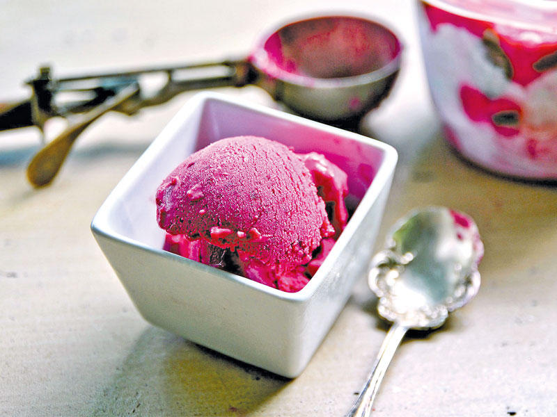 • انزعي حبوب الذرة عن الأكواز واخلطيها مع أكوازها مع الحليب، الصعتر، والكريما في قدر، ثم ضعي القدر على نار متوسطة لتغلي بخفة مدة 5 دقائق.• ارفعي القدر عن النار واتركيها جانباً مدة ساعة إلى ساعتين، ثم تخلّصي من الأكواز والصعتر.• اخفقي الذرة مع الحليب في الخلاط الكهربائي إلى أن تحصلي على خليط متجانس. أعيدي بعد ذلك كريما الذرة إلى القدر وضعيها مجدداً على نار متوسطة لتغلي بخفة.• اخلطي السكر مع صفار البيض بقوة في وعاء كبير إلى أن تحصلي على خليط خفيف فاتح اللون. أضيفي ببطء خليط الحليب الساخن إلى البيض من دون التوقف عن الخفق. ما إن تنتهي من إضافة الحليب إلى البيض، أعيدي الخليط إلى القدر عينها وضعيها مجدداً على نار متوسطة. تابعي الطهو إلى أن يشتدّ الخليط مع التحريك باستمرار (يجب أن يكون خليط الذرة والبيض أكثر كثافة بقليل من شراب القيقب).• صفي قاعدة المثلجات في مصفاة دقيقة واتركيها في البراد طوال الليل.• ضعي القاعدة السائلة في جهاز صنع المثلجات وشغليه وفق توجيهات المصنّع. أضيفي إلى المثلجات بضع أوراق من الصعتر نحو نهاية هذه العملية. احفظي بعد ذلك المثلجات في الثلاجة إلى أن يحين موعد تناولها.مثلجات الشمندر لـ 6 أشخاص