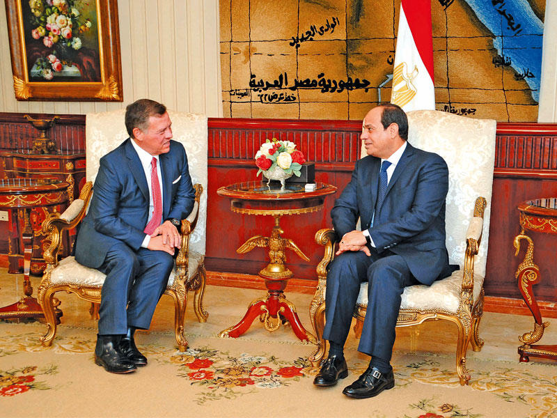 اتفق الرئيس السيسي والعاهل الأردني الملك عبدالله، خلال قمة ثنائية بالقاهرة أمس، على ضرورة العمل المشترك لدفع الجهود الرامية إلى التصدي للإرهاب، وحل القضية الفلسطينية بإقامة الدولة وعاصمتها القدس الشرقية، في وقت تعهد السيسي فيه بتقديم كشف حساب للمصريين حول فترة رئاسته بداية العام المقبل.