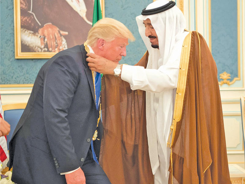 العاهل السعودي يقلد ترامب أرفع أوسمة المملكة في الرياض أمس (رويترز)
