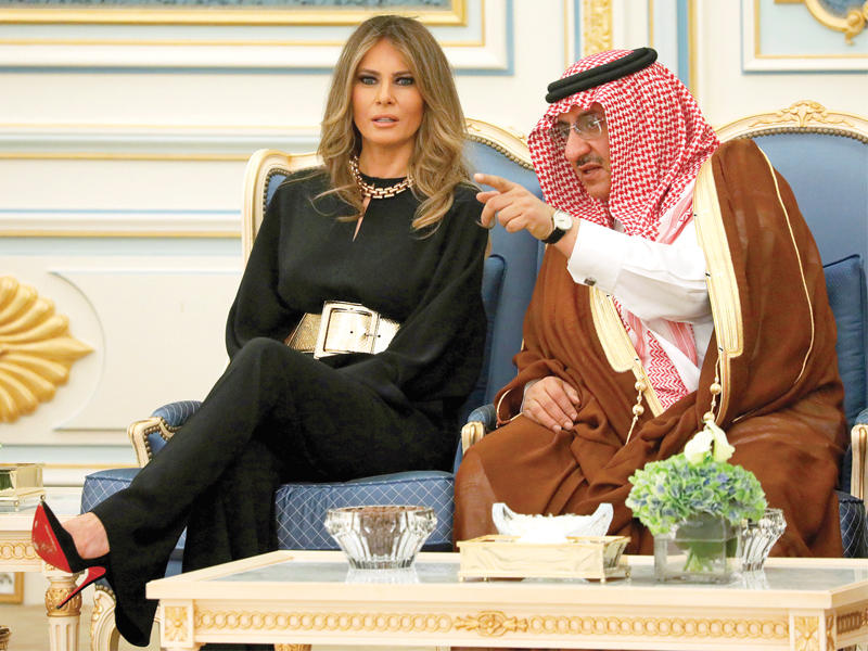 الأمير محمد بن نايف متحدثاً إلى ميلانيا ترامب في قصر اليمامة أمس (رويترز)