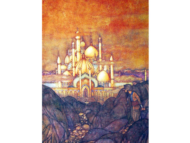 لما كانت الليلة الخامسة والعشرون بعد الثلاثمئة، قالت شهرزاد: ومما يُحكى أيها الملك السعيد، أن رجلاً كثرت عليه الديون، فترك أهله وعياله وخرج هائماً على وجهه، ولم يزل سائراً إلى أن أقبل بعد مدة على مدينة عالية الأسوار، عظيمة البنيان. دخلها وهو في حالة الذل والانكسار، واشتد به الجوع وأتعبه السفر. فيما هو يمشي في بعض شوارعها، رأى جماعة من الأكابر سائرين معاً، فمشي معهم حتى دخلوا داراً أشبه بقصور الملوك، فدخل في زمرتهم، ووجد هناك رجلاً جالساً في صدر المكان، وعليه هيبة عظيمة وجلالة جسيمة، وحوله الغلمان والخدم. لما رآهم رحب بهم. لكن الرجل لما دخل ذلك المجلس أخذه العجب مما رأى من فخامة المكان وكثرة الخدم والحشم، وصار في حيرة وكرب خائفاً على نفسه، ثم جلس وحده بعيداً عن الناس حيث لا يراه أحد. بينما هو كذلك أقبل رجل ومعه أربعة من كلاب الصيد، وعليها أنواع القز والديباج، وفي أعناقها أطواق من الذهب بسلاسل من الفضة، فربط كل واحد منها في محل مخصص له، ثم أتى لكل كلب بصحن من الذهب يفيض بالأطعمة الفاخرة، ووضع لكل كلب منها صحنه أمامه. كان الرجل جائعاً، فصار ينظر إلى ذلك الطعام، ويحدِّث نفسه بأن يتقدم إلى كلب منها ويأكل معه، ولكن الخوف منعه. ثم إن كلباً منها نظر إليه فألهمه الله تعالى معرفة حاله، فتأخر عن الصحن وأشار إليه فأقبل وأكل حتى اكتفى، ثم رجع إلى مكانه، فأخذ الكلب ذلك الصحن وألقاه أمامه، فأخذه وخرج من الدار. سافر بعد ذلك إلى مدينة أخرى فباع الصحن واشترى بثمنه بضاعة عاد بها إلى بلده فباعها، وقضي ما كان عليه من الديون، وكثر رزقه وصار في نعمة وبركة. وبعد مدة من الزمان، قال لنفسه: لا بد من أن أسافر إلى مدينة صاحب الصحن وآخذ له هدية مليحة لائقة، وأدفع له ثمن ذلك الصحن. لما وصل إلى تلك المدينة، توجه إلى القصر، فلم ير إلا أطلالاً بالية وغراباً ناعياً، ودياراً أقفرت، وأحوالا تغيرت وتنكَّرت، فارتجف منه القلب والبال، وأنشد قول من قال: خلت الزوايا من خباياها كمــــــــــــاخطت القلوب من المعارض والتقى وتنكر الوادي فما غزلانـــــــــــــــه تلك الظباء ولا النقا ذاك النقـــــــــا وقول الآخر:سرى طيفُ سعدٍ طارقاً يستفزني سحيراً وصحبي بالفلاة رقــــــودُ فلما انتبهنا للخيالِ الذي ســــرىإذا الجو قفرٌ والمزارُ بعيــــــــــدُهدية