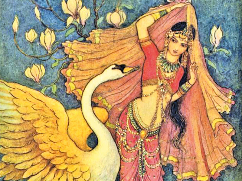 لما كانت الليلة الحادية والأربعون بعد الثلاثمئة، قالت شهرزاد: بلغني أيها الملك السعيد، أن الصائغ صار يذهب وحده إلى الصيد في البراري، ثم يذبح ما يصيده ويشوي لحمه ويأكل وحده، ولما اشتد به القلق من انفراده، دار في القصر يفتش جهاته كافة، وفتح مقاصير البنات فرأى فيها من الأموال ما يُذهب عقول الناظرين، ولكنه لم يلتذ بشيء من ذلك بسبب غيبتهن، والتهبت في قلبه النار لأجل الباب الذي أوصينه بعدم فتحه وأمرنه ألا يقربه أبداً.فقال لنفسه: ما أوصتني أختي بعدم فتح هذا الباب إلا لكونه فيه شيء تريد ألا يطلع عليه أحد، ولكن ماذا عليَّ لو فتحته لأنظر ما فيه؟ ثم أخذ المفتاح وفتح ذلك الباب، فوجد خلفه سلماً في صدر المكان معقوداً بحجر من جزع يماني، فصعد على ذلك السلم إلى أن وصل إلى سطح القصر، فقال لنفسه: أهذا الذي منعنني عنه؟ وفيما هو يتعجب من ذلك حانت منه التفاتة إلى ما وراء القصر، فإذا به يرى بستاناً لم يره سابقاً، وفيه كثير من الأشجار والأزهار، ومن الوحوش والأطيار، التي تغرد وتسبح الله الواحد القهار، فأخذ يتأمل في تلك المتنزهات، ورأى خلفها بحراً عجاجاً متلاطماً بالأمواج.نزل على الفور وتوجه إلى ذلك البستان، ولم يزل يمشي فيه حتى انتهى إلى قصر على أربعة أعمدة، وفيه مقعد منقوش بسائر الأحجار الكريمة كاليواقيت والزمرد والبلخش وأصناف الجواهر، وهو مبني طوبة من فضة، وطوبة من ذهب، وطوبة من ياقوت، وطوبة من زمرد أخضر، وفي وسط القصر بحيرة ملآنة بالماء، وعليها مكعب من الصندل وعود الند، وقد شبك بقضبان الذهب الأحمر والزمرد الأخضر، ومزركش بأنواع من الجواهر واللؤلؤ وكل حبة منها قدر بيضة الحمامة، وعلى جانب البحيرة تخت من العود مرصع بالدر والجواهر، مشبك بالذهب الأحمر، وفيه مختلف الفصوص الملونة والمعادن النفيسة يقابل بعضها بعضاً، وحوله الأطيار تغرد بلغات مختلفة وتسبح الله بحسن أصواتها ومختلف لغاتها، فقال حسن: {مثل هذا لم يملكه كسرى ولا قيصر}، وجلس ينظر إلى ما حوله وهو متعجب مما يرى من حسن الصنعة وكثرة الجواهر من الدر والياقوت والزمرد، كما يتعجب من تلك المزارع والأطيار التي تسبح الله الواحد القهار.وفيما هو يتأمل عمارة هذا القصر العظيم الشأن، إذا بعشرة طيور أقبلت من جهة البر، قاصدة إلى بحيرة ذلك القصر، فقام حسن واختبأ خلف بعض الأشجار حتى لا تراه فتفزع منه فتمضي في طيرانها ولا تحط لشراب، وبعد قليل حطت الطيور العشرة على شجرة عظيمة مليحة، ورأى حسن بينها طائراً عظيماً، وهو أحسنها شكلاً، والطيور التسعة الأخرى كلها في خدمته، فتعجَّب حسن من ذلك.ثم صار ذلك الطائر ينقر التسعة بمنقاره، وهي تظهر له الخضوع، وبعد ذلك شق كل طائر جلده بمخالبه وخرج منها فإذا هو ثوب من ريش، وخرجت من الثياب عشر بنات يفضحن بحسنهن الأقمار، وبعدما خلعن ثيابهن، نزلن في البحيرة، وصرن يلعبن ويتمازحن، بينما صاحبتهن الممتازة عليهن تغطسهن في الماء فيهربن منها، ولا يمددن أيديهن إليها، فلما نظر حسن جمالها وقدها واعتدالها، غاب عنه صوابه وسلب عقله، وعرف أن أخواته ما نهينه عن فتح ذلك الباب إلا لهذا السبب.ولم يزل حسن واقفاً ينظر إليهن، ويتحسَّر على أنه ليس معهن، وحار عقله من حسن الفتاة الكبيرة، وتعلق قلبه بشرك محبتها ووقع في هواها، واتقدت في قلبه النيران شوقاً إلى الوصول إليها، ثم خرجن من البحيرة، وهو واقف ينظر إليهن، وهن لا يرينه، وما زال متعجباً من فرط جمالهن ولطف معانيهن وظرف شمائلهن.لما خرجن من الماء لبست كل واحدة ثيابها وحليها، أما الجارية الكبيرة فإنها لبست حلة خضراء، ففاقت بجمالها الملاح كلهن، وزهت بهجة وجهها على نور الصباح، كما فاقت على الغصون بحسن التثني، وأذهلت العقول بوهم التمني، وكانت كما قال الشاعر:وجارية في نشاط بـــــــدتترى الشمس من خدها مستعارةأتت في قميص لها أخضــركخضر الغصون على جلنارهفقلت لها: ما اسم هذا اللباس؟فقالت كلاماً مليح العبارةشققنا مرائر أحبابناففاح نسيم يشق المرارةوأدرك شهرزاد الصباح، فسكتت عن الكلام ال