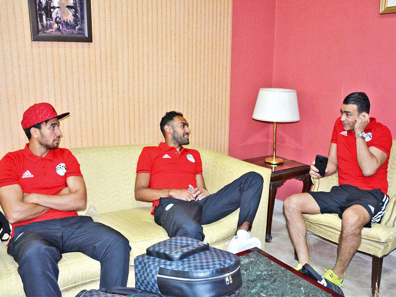 وقام محمد صلاح المحترف في روما الإيطالي بتوزيع قمصان "الملك" فرانشيسكو توتي على بعض من زملائه في المنتخب المصري الذين طلبوا منه الحصول على القميص الخاص به عقب إعلانه الاعتزال بنهاية الموسم المنقضي، وهم: أحمد الشناوي حارس مرمى الزمالك، وطارق حامد وسط الزمالك، وعمرو جمال مهاجم الأهلي.شهد معسكر المنتخب جلسات مع الأرجنتيني كوبر حذرهم خلاله من الاستهتار بضربة البداية أمام منتخب قوي مثل تونس بدعوى أن المشوار لا يزال طويلاً، مُهدداً باستبعاد أي لاعب لا يؤدي في الفترة المقبلة بشكل جيد، خاصة بعد تألق أكثر من وجه جديد في الدوري المصري وتأكيده وجود محترفين سينضمون للفراعنة في الفترة المقبلة، كما طلب من الجهاز الإداري فرض السرية على المعسكر وعلى المران وعدم تواجد أي فرد غير مصرح له بالتواجد في الفندق أو الملعب.واكتملت صفوف المنتخب المصري، بانضمام عمر جابر إلى المعسكر المقام باستاد برج العرب، ليكمل عقد القائمة المصرية التي تضم كلا من:عصام الحضري (وادي دجلة) وأحمد فتحي (الأهلي) وشريف إكرامي (الأهلي) وعبد الله السعيد (الأهلي) وحسام عاشور (الأهلي) وأحمد حجازي (الأهلي) وأحمد الشناوي (الزمالك) وسعد سمير (الأهلي) ورامي ربيعة (الأهلي) وطارق حامد (الزمالك) ومحمود عبد المنعم "كهربا" (الزمالك) وعمرو جمال (الأهلي) وعلي جبر (الزمالك) ومصطفى فتحي (الزمالك) وأحمد الشيخ (مصر المقاصة ) وأحمد المحمدي (هال سيتي الإنكليزي) ومحمد عبد الشافي (أهلي جدة السعودي) ومحمد النني (أرسنال الإنكليزي) ومحمد صلاح (روما الإيطالي) وعمر جابر (بازل السويسري) ومحمود حسن "تريزيغيه" (أندرلخت البلجيكي) وكريم حافظ (لانس الفرنسي) ورمضان صبحي (ستوك سيتي الإنكليزي) وعمرو وردة (باوك اليوناني).
