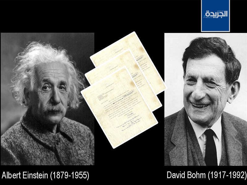 في رسالة كتبها أينشتاين عام 1951 لعالِم الفيزيائي المعروف ديفيد بوم، يناقش أينشتاين ربط بوم بين نظرية الكم ونظرية النسبية العامة.ويقول أينشتاين في الرسالة "يجب أن أعترف أنني لست قادرا على تخمين كيف يمكن تحقيق هذا الربط".وتحتوي الرسالة المطبوعة على الآلة الكاتبة، أيضا على معادلة كتبها أينشتاين يدويا بخط يده الأنيق بالإضافة إلى توقيعه.وبوم، الذي ولد في الولايات المتحدة لوالدين يهوديين مهاجرين، عمل مع أينشتاين في جامعة برينستون العريقة قبل أن يهرب إلى البرازيل بعد خسارته منصبه في حملة "المكارثية" الشرسة التي اطلقها السناتور الاميركي جوزف مكارثي في خمسينات القرن الماضي بهدف تضييق الخناق على الناشطين في الشيوعية أو المؤيدين لها.وفي رسالة أخرى وجهها أينشتاين في عام 1954 إلى بوم الذي كان يعيش في مدينة ساو باولو، أعرب الفيزيائي الشهير عن تعاطفه مع الصعوبات التي كان يمر بها صديقه في عمله النظري المعقد. ويقول فيها "إن كان الله خلق العالم فأن هدفه الأساس لم يكن أن يجعل فهمه أمرا سهلا علينا.. وأنا أشعر بذلك بقوة منذ خمسين عاما".وتطرقت رسالة أخرى من عام 1954 إلى إمكانية انتقال بوم إلى إسرائيل التي كانت دولة جديدة، إثر قيامها عام 1948.وكان أينشتاين رفض أن يصبح رئيسا لإسرائيل، مشيرا إلى أن الوقت لم يكن مناسبا لتلك الخطوة.وكتب العالم أن "إسرائيل مزدهرة فكريا ومثيرة للاهتمام، ولكن إمكاناتها محدودة للغاية، والتوجه إلى هناك بنيّة المغادرة في أول فرصة ليس أمرا جيدا".وأصبح العالم بوم أستاذا زائرا في معهد "التخنيون" التقني الاسرائيلي في عام 1955 لعامين.وقالت دار وينرز عن بوم "بعدها بعامين، انتقل إلى انكلترا حيث عمل في جامعات لندن وبريستول".وكان اينشتاين شغل في السابق منصب رئيس غير مقيم للجامعة العبرية في القدس حتى وفاته عام 1955.وترك أينشتاين أيضا محفوظاته من الوثائق في الجامعة العبرية.