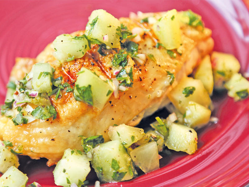 • كوب وثلث من مكعبات شمام كوز العسل المقشّر ومنزوع البذور أو أي نوع آخر من الشمام.• ربع كوب من الكزبرة الطازجة المفرومة وربع كوب آخر من ورق الكزبرة.• ربع كوب من البصل الأحمر المقطّع إلى مكعبات رفيعة.• ملعقتان كبيرتان من عصير الليمون الأخضر الطازج.• ملعقتان كبيرتان من زيت الزيتون• ملعقتان صغيرت.ان من قشور الليمون الأخضر المبروش.• ملعقة صغيرة من فلفل سيرانو المفروم ومنزوع البذور.• رذاذ زيت نباتي غير لاصق.• 4 أنصاف صدور دجاج مسحّبة مع الجلد.الطريقة: