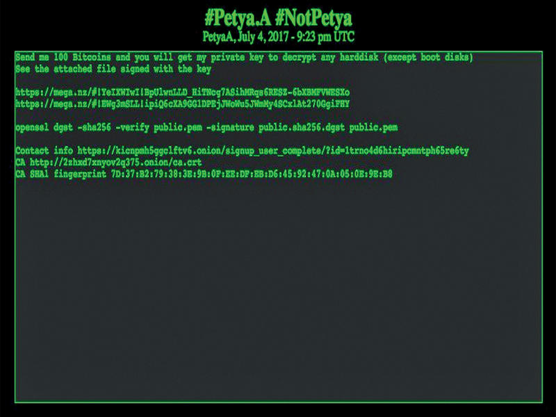 نشرت المجموعة المطورة لفيروس انتزاع الفدية Petya رسالة مفادها طلب دفع 260 ألف دولار لتقديم مفتاح فك تشفير الملفات التي تسبب فيها الفيروس.