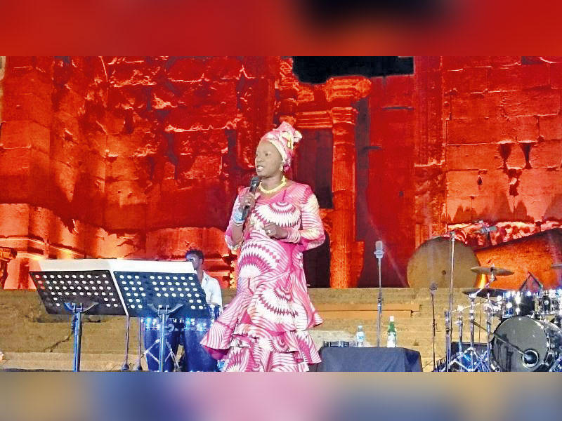 أحيت الفنانة أنجيليك كيدجو حفلة غنائية على مدرجات معبد باخوس، ضمن فعاليات مهرجانات بعلبك الدولية. أطلّت بزيها الأفريقي، يحيط بها أعضاء فرقتها الرباعية على الغيتار والطبول وآلات الإيقاع، وقدّمت على مدى ساعة ونصف ساعة حفلةً امتازت بالحيوية والمرح والتفاعل المباشر مع الجمهور، وهي غنّت بين صفوف المدرجات، ودعت جمهورها إلى مشاركتها الرقص على خشبة المسرح، كذلك أشركت محبي فنها بالغناء لمقاطع من أغانيها.وأبدت كيدجو ارتياحها لمشاركتها في مهرجانات بعلبك في اليوم الذي صادف عيد ميلادها، مثنية على حسن الاستقبال. وأدت 17 أغنية، أربع منها لميريام ماكيبا، وأربع لسيليا كروز، وثلاث لنينا سيمون، وخصّت سفيرتنا إلى النجوم فيروز بأغنية «كانوا يا حبيبي»، معتذرة على عدم إجادتها اللغة العربية، وخمس من أغانيها أشهرها Afirika، وكان الختام مع Tumba ذات إيقاع الجاز الأفريقي.