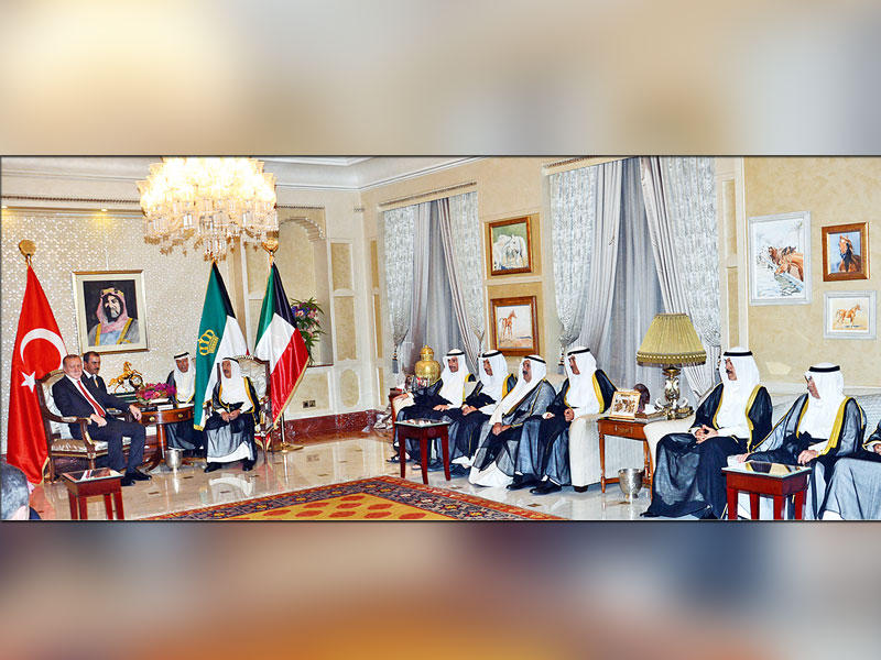 وفي وقت لاحق استقبل سمو الأمير، الرئيس التركي رجب طيب إردوغان، القادم من السعودية، في إطار جولة خليجية من المقرر أن ينهيها غداً في الدوحة. وأجرى سمو الأمير جولة محادثات مع الرئيس التركي، تناولت آخر مستجدات الأزمة الخليجية، بالإضافة الى تطورات الأوضاع في العالم.الملك سلمان وإردوغان