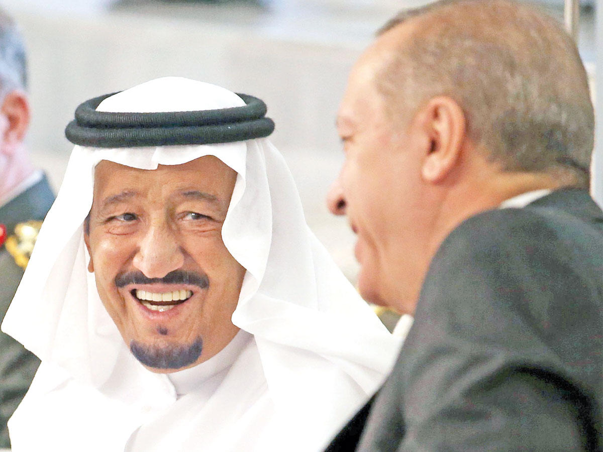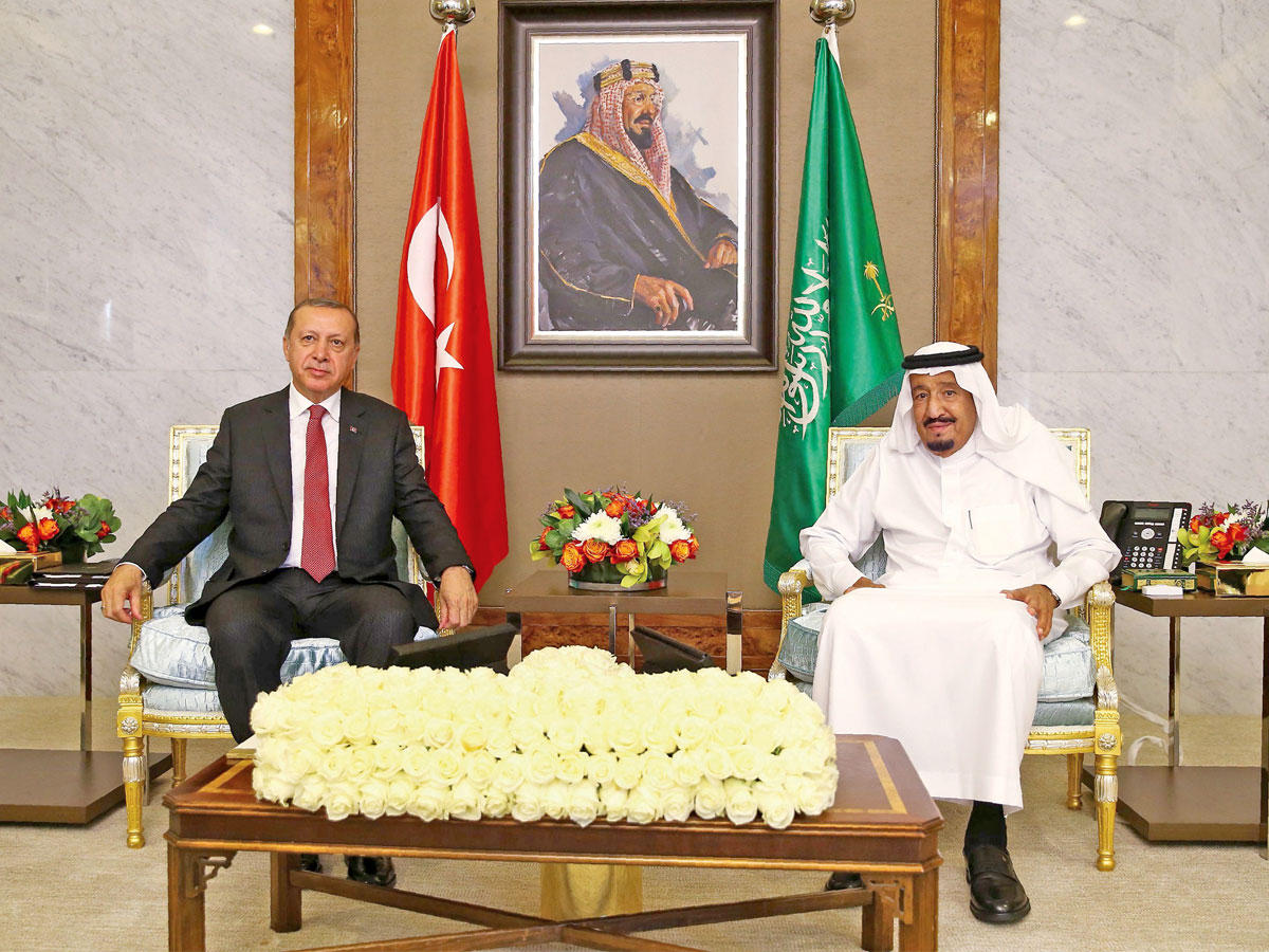 وفي جدة، عقد العاهل السعودي الملك سلمان بن عبدالعزيز جلسة مباحثات مع إردوغان في قصر السلام، بحثا خلالها "الجهود المبذولة لمكافحة الإرهاب ومصادر تمويله".وذكرت وكالة الأنباء السعودية الرسمية (واس) أن الملك سلمان وإردوغان استعرضا خلال المباحثات، العلاقات بين البلدين، كما بحث الجانبان السعودي والتركي تطورات الأوضاع في المنطقة.واستقبل سمو الأمير بدار سلوى الرئيس التركي رجب طيب اردوغان، وذلك بمناسبة زيارة العمل التي يقوم بها للبلاد.وحضر اللقاء رئيس مجلس الأمة مرزوق الغانم، ورئيس مجلس الوزراء سمو الشيخ جابر المبارك، ووزير شؤون الديوان الأميري الشيخ ناصر صباح الأحمد، الى جانب صباح الخالد وكبار المسؤولين بالدولة.وعقدت المباحثات الرسمية بين الجانبين، وقد تناولت استعراض العلاقات الثنائية التي تربط الكويت بالجمهورية التركية الصديقة وسبل تعزيزها وتنميتها على الصعد كافة بما يخدم مصالح البلدين والشعبين الصديقين، كما تضمنت المباحثات بحث القضايا ذات الاهتمام المشترك، وآخر المستجدات بالمنطقة.وساد المباحثات جو ودي عكس روح التفاهم والصداقة التي تتميز بها العلاقات الطيبة بين البلدين في خطوة تجسد رغبة الجانبين في تعزيز التعاون القائم بينهما في كل المجالات. وأقام سمو الأمير بدار سلوى مأدبة عشاء على شرف إردوغان والوفد الرسمي المرافق له.إردوغان يجدد دعمه