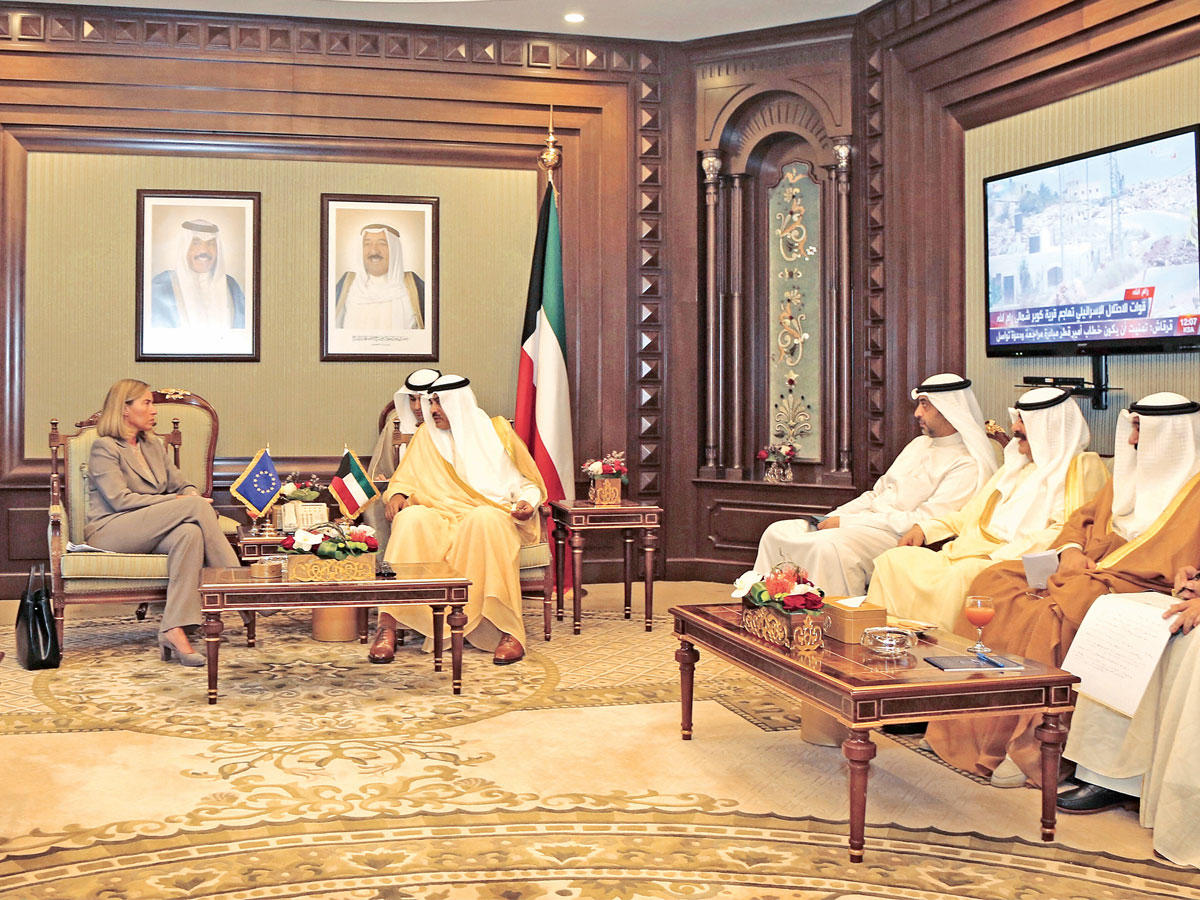 استقبل سمو أمير الكويت الشيخ صباح الأحمد، أمس، في قصر بيان الممثلة العليا للشؤون الخارجية والأمنية في الاتحاد الأوروبي، نائبة رئيس المفوضية الأوروبية فديريكا موغيريني، وبحث معها مستجدات الأزمة بين قطر من جهة، والسعودية والإمارات ومصر والبحرين من الجهة الأخرى، بحضور النائب الأول لرئيس مجلس الوزراء الكويتي، وزير الخارجية الشيخ صباح الخالد، ووزير الدولة لشؤون مجلس الوزراء وزير الإعلام بالوكالة الشيخ محمد العبدالله.