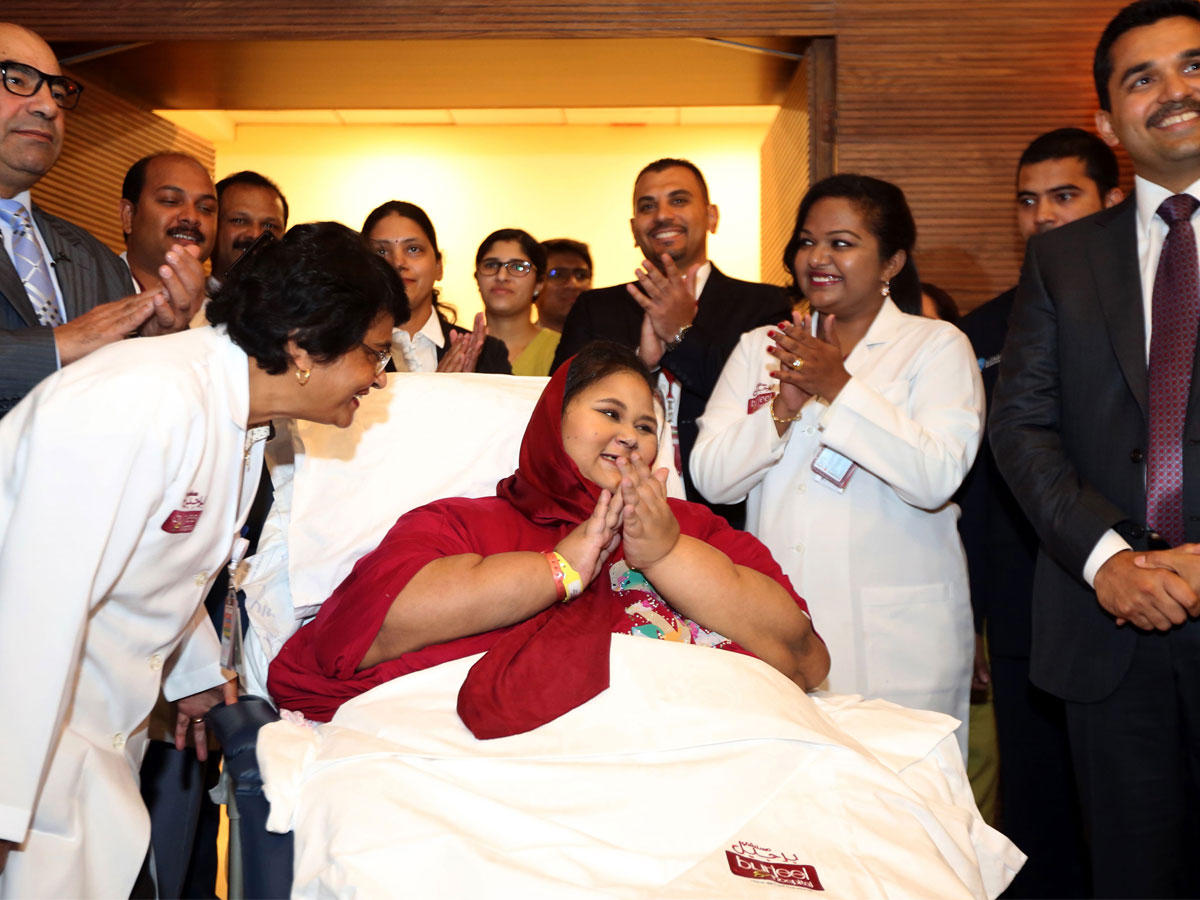 بعد مرور نحو شهرين ونصف الشهر، على وصول الفتاة المصرية إيمان عبدالعاطي إلى مدينة أبوظبي الإماراتية، لاستكمال رحلة علاجها في مشفى برجيل، أطلت إيمان على الصحافيين في مؤتمر عقده المشفى أمس، وبدت رشيقة مقارنة بوزنها الأصلي (500 كيلوغرام).دخلت إيمان قاعة المؤتمر محمولة على سرير طبي مجهز خصوصاً لها، وابتسمت للحضور ملوحة بيديها لتحيتهم، وهي المرة الأولى التي تظهر فيها بهذا القدر الكبير من التحسن، بعد خضوعها لمرحلة علاجية على يد نحو 20 طبيباً متخصصاً.
