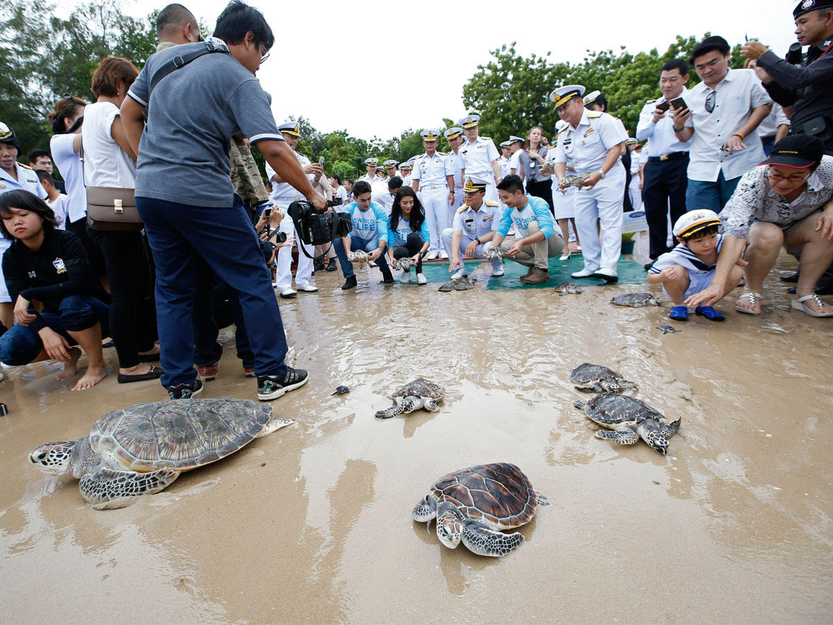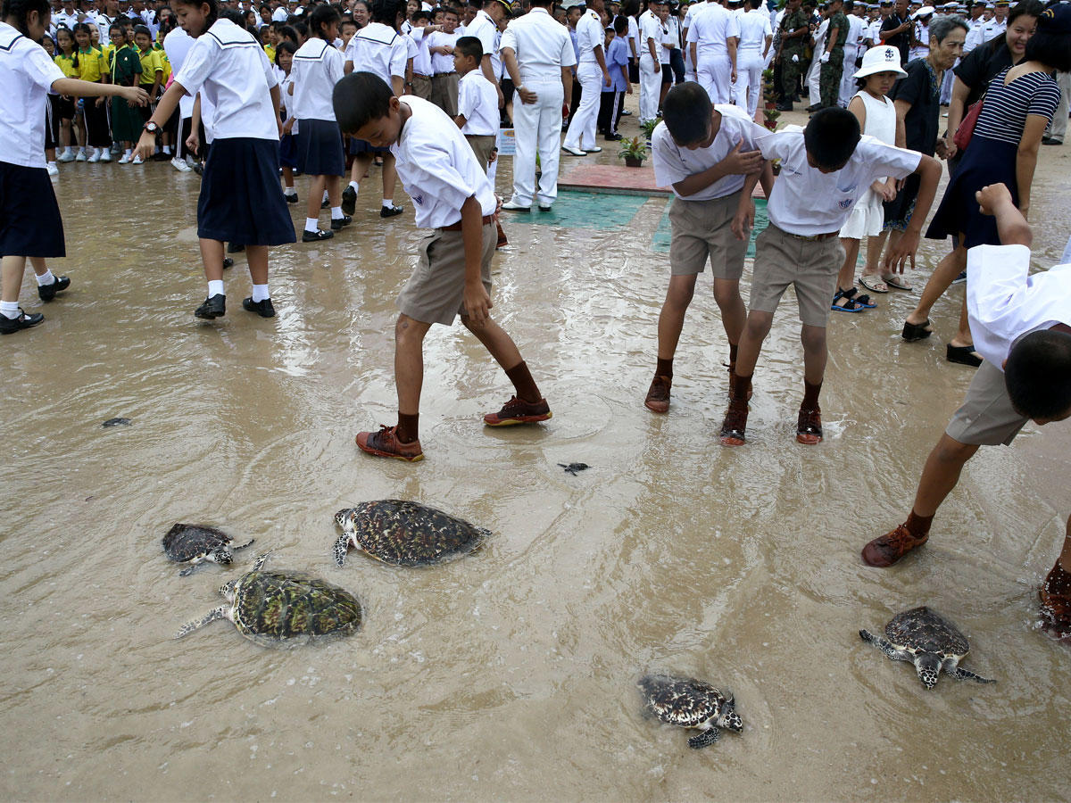 في مركز حماية السلاحف البحرية بتشونبوري، على بُعد نحو 75 كيلومتراً جنوب شرقي العاصمة التايلندية (بانكوك)، تجمَّع أمس المئات من رجال ونساء البحرية الملكية وطلبة ومشاهير، لإطلاق 1066 سلحفاة بالبحر، في إطار الاحتفالات بعيد ميلاد الملك الجديد ماها فاجيرالونجكورن، الذي يحل هذا الأسبوع.ويعتقد البوذيون في تايلند، أن إطلاق حيوانات من الأسر وسيلة لجلب الحظ السعيد.