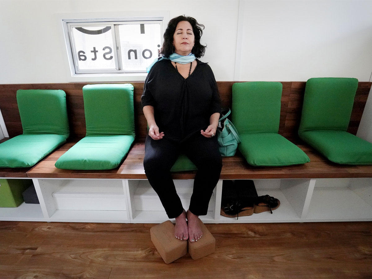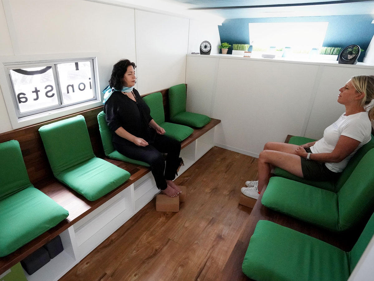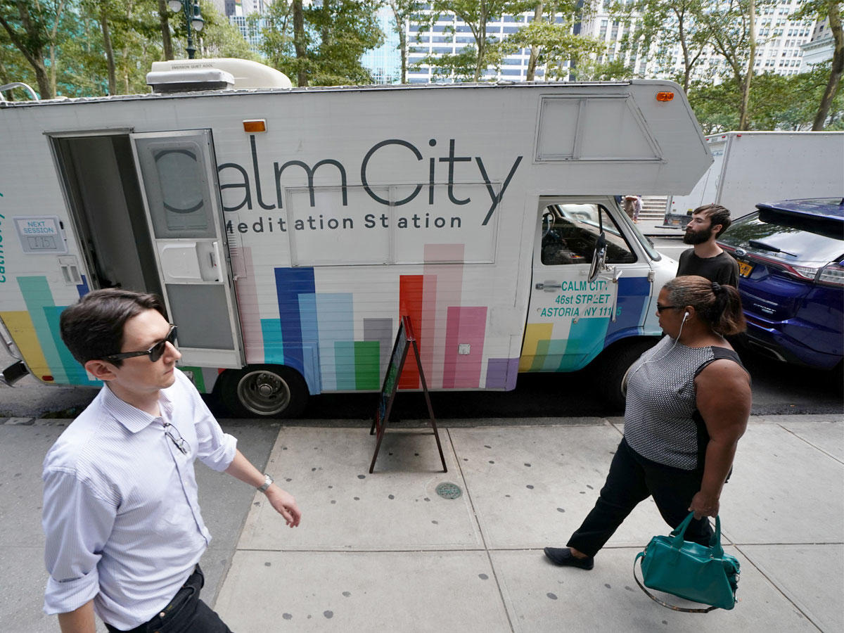 أقامت معلمة معتمدة للتأمل جلسات داخل شاحنة معدلة، أمس الأول، في وسط مانهاتن بمدينة نيويورك، وشجعت المارة على الانضمام إليها في استراحة ذهنية مدتها عشر دقائق.وقالت كريستين وستبروك (50 عاماً)، وهي تقف بجوار شاحنتها قرب متنزه برايانت بارك وعدد من شاحنات الأطعمة، إنها افتتحت استديو التأمل المتنقل (كالم سيتي) في مايو الماضي، لتخفيف التوتر الذي يصيب الناس.وشاهدت سوزان (55 عاماً) الشاحنة المتوقفة حينما كانت عائدة إلى الفندق التي تقيم به في ساحة تايمز سكوير، وتوقفت لجلسة تأمل مدتها عشر دقائق مقابل عشرة دولارات.
