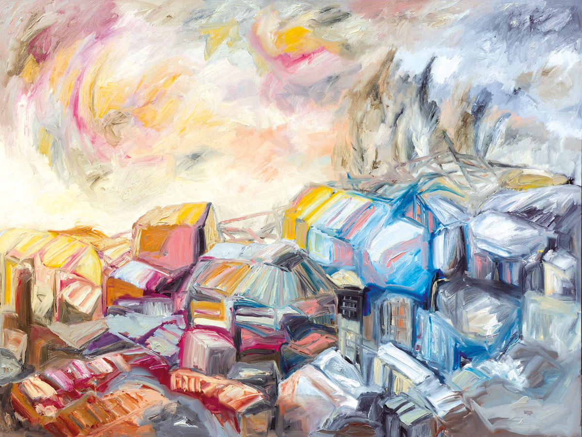 في معرضه «أطلال بعيدة» الذي تنظمه «غاليري زمان» في بيروت (6 سبتمبر- 28 أكتوبر 2017)، يقدِّم الرسام التشكيلي السوري فتح الله زمرود، لوحات مفعمة ترمز إلى مجموعة مآوٍ مؤقتة وأماكن مهجورة، وتستحضر إلى الواجهة الآثار التي تخلّفها الحرب على النسيج العمراني ويصعب تجاهلها، وتتمثل بهياكل بنيانية مؤقتة ومظاهر طبيعية سرعان ما تأخذ مجراها، سامحة للغطاء النباتي المتمدد أن يقف شاهداً على مرور الزمن. يقف الناظر وحيداً أمام اللوحات الضخمة الصامتة الخالية من أي وجود إنساني، محروماً التماهي مع أية شخصيّة متخيّلة ضمن العمل. تبدو السكينة في هذه الأعمال مفهوماً متضارباً، حيث تحاكي ضربات الفرشاة الإيمائية والخطوط الانسيابية الآثار الملموسة التي تخلّفها المآسي على البنية والبيئة المحيطة، لذا لا تعتبر بمثابة شاهد على الصدمة والنزاع فحسب بل على الأمل والإصرار أيضاً. تبدو السماء خلف تلك المنازل المؤقتة، متصادمة مع الأرض تحتها كما لو أن عاصفة هوجاء هبطت فوق المشهد مبعثرة كل ما يمرّ في طريقها، كبحرٍ هائج من اللون يجتاح حياً مكتظاً بكثافة عمرانية هائلة من البنية المتهالكة، محتلاً واجهة اللوحة. أما الخلفيّة الفسيحة والهائجة فتتجسّد من خلال الغيوم السائرة بسرعة في السماء وتتابع الهضاب وهي تتحرّك بانسجام تام في ما بينها. هذه العناصر مجتمعة تعيد إلى الذهن قوة الطبيعة التي تتجسّد في المناظر الطبيعية للفنان التعبيري النمساوي أوسكار كوكوشكا. فكما فنان القرن العشرين يتبع زمرود تجاه تلك المشاهد مقاربة تتجسّد في اعتباره التضاريس تعبيراً مجازياً يرصد صراع الإنسان ويصوّره من خلال مشاهد متبدّلة فيها حسّ ينذر بالشؤم. يهيمن تجريد الواقع على النمط التشكيلي لكلا الفنانين، حيث يتمّ ردّ التضاريس إلى عناصرها الأولية المتمثلة بضربات فرشاة ذاتية المرجعية واستخدامات إيمائية للون.
