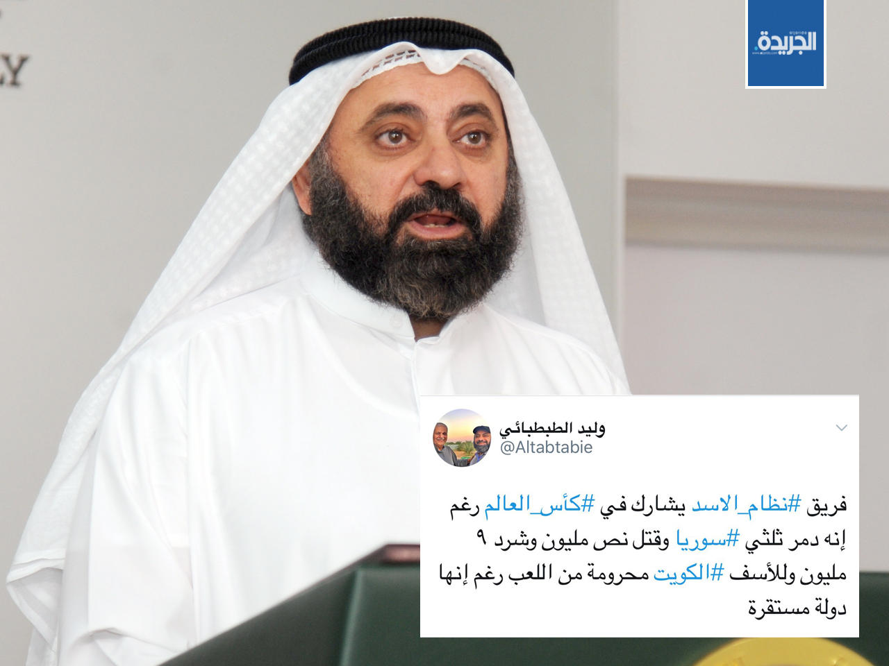 وقال الطبطبائي عير حسابه في «تويتر»: فريق نظام الأسد يشارك في كأس العالم رغم إنه دمر ثلثي سوريا وقتل نص مليون وشرد 9 مليون وللأسف الكويت محرومة من اللعب رغم إنها دولة مستقرة.