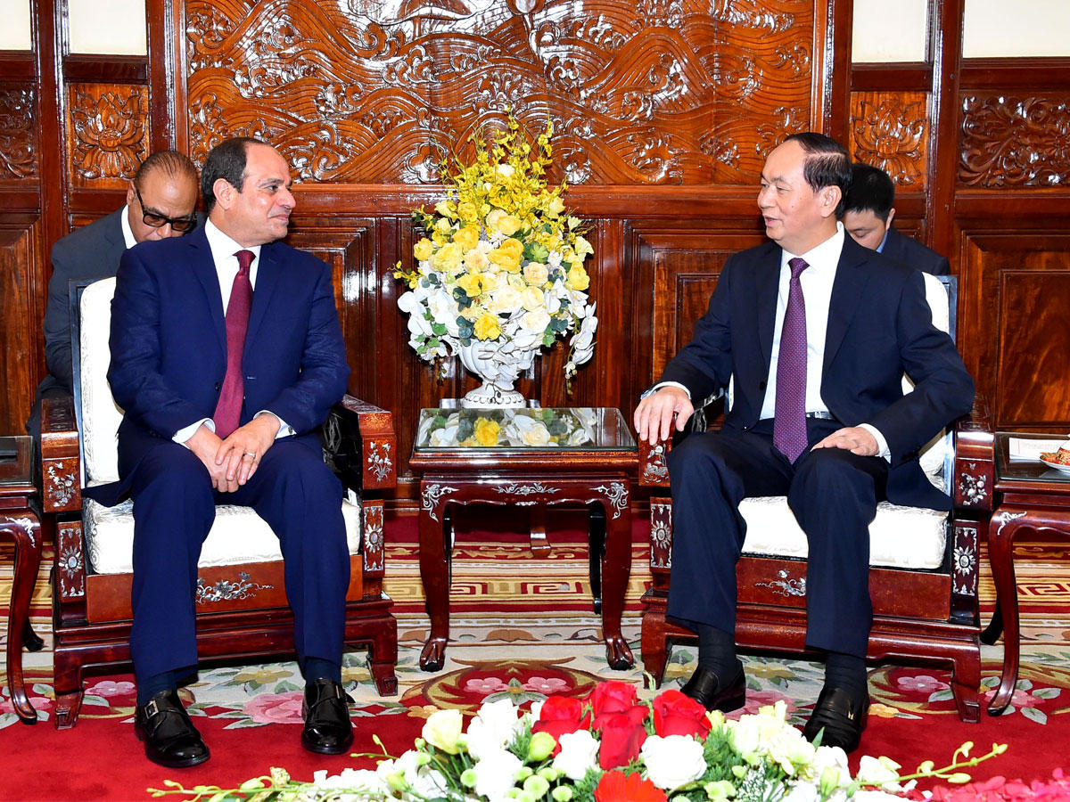 في زيارة هي الأولى من نوعها في تاريخ العلاقات بين البلدين، بدأ الرئيس عبدالفتاح السيسي زيارة رسمية إلى جمهورية فيتنام، أمس، ووصل السيسي إلى مطار هانوي، حيث كان في استقباله عدد من كبار المسؤولين الفيتناميين والسفراء العرب والأفارقة، واستهل برنامج الزيارة بوضع إكليل من الزهور على ضريح الزعيم الفيتنامي الراحل "هو تشي منه"، والنصب التذكاري للشهداء الفيتناميين في الحرب الأميركية الفيتنامية.وكان الرئيس الفيتنامي تران داي كوانغ، على رأس مستقبلي الرئيس السيسي، في القصر الجمهوري بهانوي، وأقيمت مراسم استقبال رسمي، ثم عقد الرئيسان جلسة مباحثات ضمت وفدي البلدين، وصرح المتحدث باسم الرئاسة المصرية علاء يوسف، بأن رئيس فيتنام استهل المباحثات بالإشارة إلى أن زيارة السيسي تكتسب أهمية خاصة، في ضوء أنها أول زيارة لرئيس مصري لفيتنام منذ بدء العلاقات الديبلوماسية بين البلدين عام 1963.وأكد السيسي حرص بلاده على تطوير التعاون مع فيتنام في المجالات المختلفة، واستعرض برنامج التنمية الاقتصادية المستدامة الذي تطبقه الحكومة، في ضوء توفر العديد من الفرص الواعدة للمستثمرين، فيما رد الرئيس الفيتنامي بإعلان حرص بلاده على تطوير وزيادة التعاون مع مصر في المجالات الاقتصادية، وأشار إلى أن حجم التعاون الاقتصادي بين البلدين لا يرقى إلى مستوى قدراتهما، وأنه ينبغي العمل على زيادة حجم التبادل التجاري.