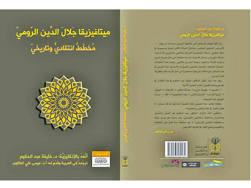 صدر عن دار «نينوى للدراسات والنشر والتوزيع» كتاب «ميتافيزيقا جلال الدين الرومي»، تأليف خليفة عبد الحميد، وتحقيق عيسى علي العاكوب. مما جاء في المقدمة:«الكم الهائل للمسائل التي عالجها الرومي استدعاه أن يقول: «.. لأغراض التحقيق الحاضر، سنتناولُ المسألة الأكثر أهمية وصميمية في عالمه الفكري: مسألة الشخصية الفردية، والإلهي، والبشري. إلا أن هذه المسألة تتفرع إلى مسائل فلسفية أساسية مختلفة، من مثل طبيعة الروح، وحرية الإرادة، والخلود، وصلة البشري بالإلهي. وتحت هذه العُنوانات الجُزئية المختلفة، سنحاول تلخيص التصورات الأساسية عند الرومي في هذه المسائل، مع إحالاتٍ تاريخيةٍ مختصرةٍ إلى أصل كل مسألةٍ وتطورها قبل الرومي».