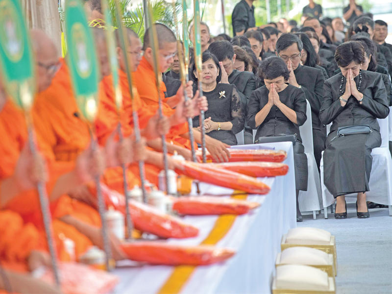 وفي المساء، نظمت مراسم بوذية بالقصر الكبير في بانكوك حيث يرقد جثمان الملك الراحل. وترأس تلك المراسم الملك ماه فاجيرالونجكورن، الابن الوحيد للملك الراحل بوميبول.وكان بوميبول من أكثر ملوك العالم مكوثاً على العرش، حيث توفي في 13 أكتوبر من العام الماضي عن عمر ناهز 88 عاماً بعد سبعة عقود على العرش.وشهدت البلاد فترة حداد مدة عام منذ وفاة الملك، وسيحرق جثمانه في مراسم تستغرق 5 أيام بعد تحضير استمر سنة كاملة، وذلك خلال الفترة من 25 حتى 29 الجاري في ساحة بالقرب من القصر الكبير، لتنتهي بذلك فترة الحداد.