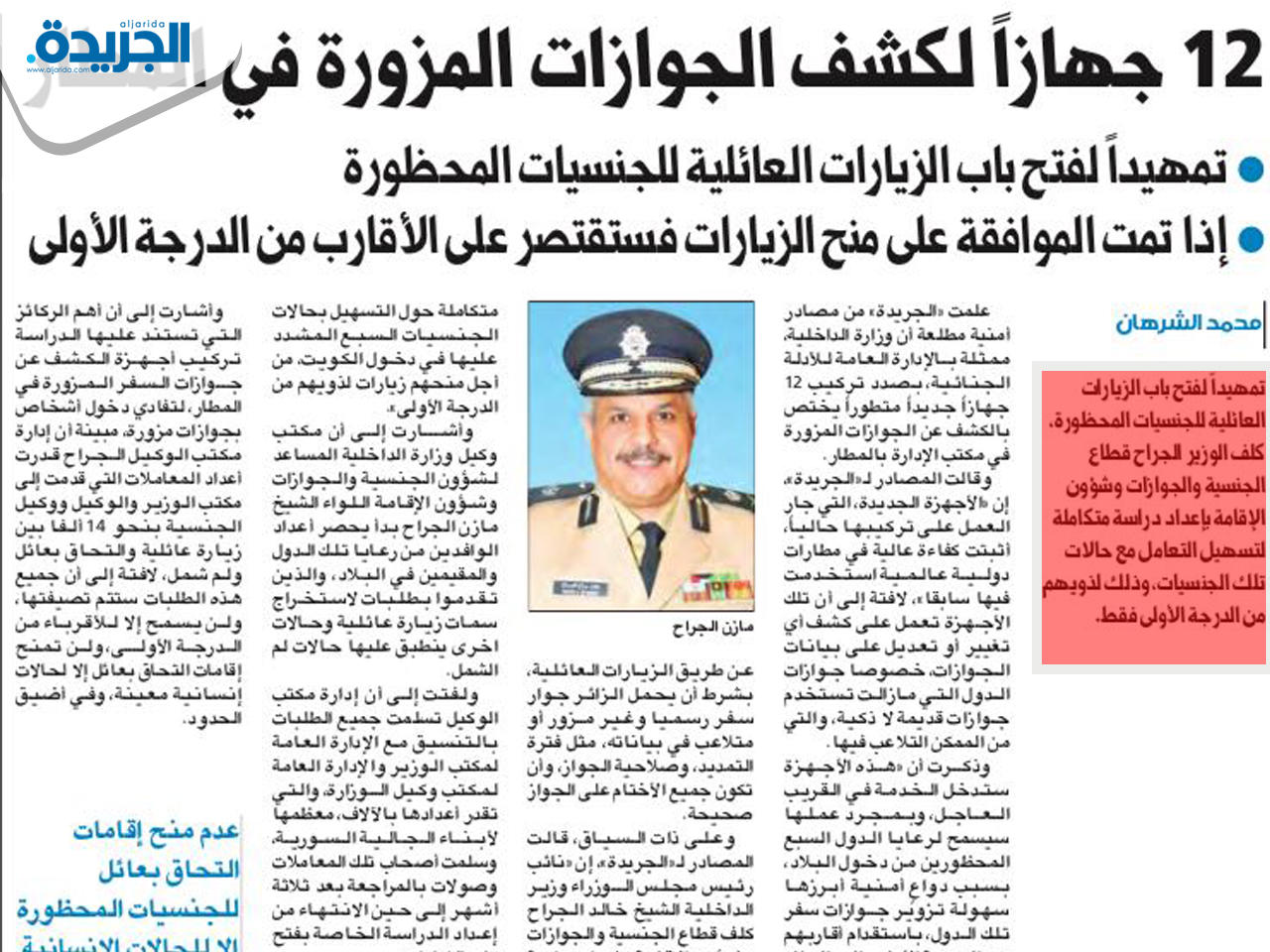 تأكيداً لما انفردت به «الجريدة» في عددها الصادر بتاريخ 8 أكتوبر الماضي حول القرارات الخاصة بتعديل أوضاع أبناء الجالية السورية، أكد وكيل وزارة الداخلية المساعد لشؤون الجنسية والجوازات اللواء الشيخ مازن الجراح، أنه «سعياً من القيادة العليا للمؤسسة الأمنية ممثلة في نائب رئيس مجلس الوزراء وزير الداخلية الشيخ خالد الجراح، إلى لم شمل الأسر السورية المقيمة بدولة الكويت، فقد تقرر تعديل أوضاع المخالفين (الزوجة-الأبناء) فقط، بمنحهم إقامات وفق المادة 22 (التحاق بعائل) من قانون إقامة الأجانب وفق الضوابط الآتية:- أن يكون الكفيل مستوفياً للشروط المطلوبة كالراتب، وعدم وجود قيود أمنية تحول دون كفالته.