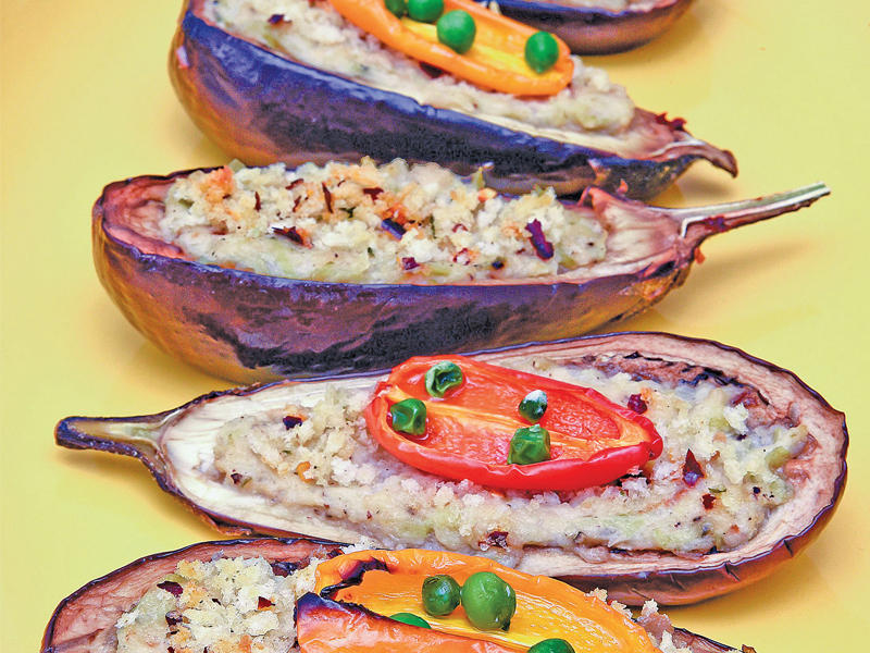 يحتفظ الباذنجان بقشرة متكاملة وتركيبة طرية عند خبزه. وإذا رغبتِ في إعداد طبق مخبوز بسيط، قطعي الباذنجان (يُعتبر من الفاكهة من الناحية النباتية لأنه يحتوي على البذور) بالطول إلى شرائح بعرض سنتمتر تقريباً. اطلي الشرائح بزيت الزيتون وطيبيها بملح كوشر والفلفل الأسود المطحون الطازج. واتركيها في الفرن على حرارة 170 درجة مئوية مدة 20 إلى 30 دقيقة. وهكذا تصبح جاهزة. يمكنك تناول الشرائح وحدها أو تغميسها باللبن المطيب بالثوم.أما إذا أردتِ إعداد طبق أكثر تعقيداً، فأزيلي أولاً اللب الطري، ثم املئي الباذنجان بالخضراوات التي تكتسب نكهة لذيذة أثناء الطهو وتختلط بصلصة البيشاميل، فضلاً عن اللب الذي أزلته. رشي فوق الطبق قليلاً من الكعك المسحوق لتضفي عليه قرمشة لذيذة. أخيراً، زينيه بقرون فلفل حلو صغيرة مقطوعة بالطول إلى نصفَين كي تمنحي الوصفة طبقة إضافية من اللون والطعم اللذيذ.