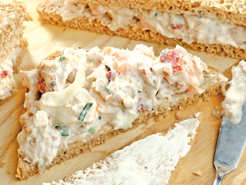 • اخلطي الجبنة القشدية الطرية مع الكريما الحامضة في وعاء متوسط الحجم وتابعي الخلط إلى أن تحصلي على خليط متجانس. أضيفي إليهما بشر الليمون الحامض، الملح، الفلفل، والصلصة الحارة وتابعي الخفق إلى أن تمتزج المكونات كافة جيداً. أضيفي بعد ذلك الشمر، الفليفلة الحمراء، والثوم المعمر وواصلي التحريك. وأخيراً، أضيفي السلمون المعلب والمدخن. غطي الخليط واحفظيه في البراد مدة تصل إلى 3 أو 4 أيام.• لإعداد السندويتشات، مدّي طبقة رقيقة من الزبدة الطرية (إن قررت استعمالها) على أحد جانبي الخبز. أضيفي فوقها طبقة من خليط السلمون سماكتها نحو سنتمتر. زينيها كما تشائين، وقدميها مع شوكة وسكين (أو غطيها بشريحة ثانية من الخبز المطلي بالزبدة وانسي أمر الشوكة والسكين). في الحصة: 249 سعرة حرارية، 10 غرامات من الدهون، 4 غرامات من الدهون المشبعة، 57 مليغراماً من الكولسترول، 19 غراماً من النشويات، 5 غرامات من السكر، 18 غراماً من البروتين، 733 مليغراماً من الصوديوم، و2 غرام من الألياف.تارت الطماطم