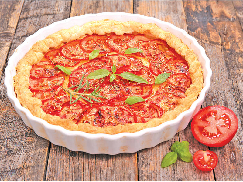 • ربع كوب (غير مضغوط) من أوراق الريحان المقطعة.• ربع كوب من جبنة بارميزان الطازجة المبشورة.• ملعقة كبيرة من أوراق الزعتر الطازج.• عجينة تارت.• 700 غرام من الطماطم الناضجة (من الأفضل اختيار خليط من الألوان والأحجام المختلفة) المقطعة إلى دوائر رقيقة.• زيت زيتون.• قليل من الملح والفلفل.الطريقة: